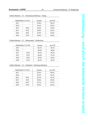 Drucksache 19/4761 – 30 – Deutscher Bundestag – 19. Wahlperiode Vorabfassung - wird durch die lektorierte Version ersetzt. S-Bahn München – S 2 – Petershausen (Oberbay) – Erding Pünktlichkeit % (5:59) Gesamt per JUN 2017 95,8% 96,2% 2018 94,3% 94,3% 2017 HVZ 95,4% 95,9% 2017 NVZ 96,0% 96,5% 2018 HVZ 93,9% 93,9% 2018 NVZ 94,6% 94,6% S-Bahn München – S 3 – Mammendorf – Holzkirchen Pünktlichkeit % (5:59) Gesamt per JUN 2017 96,1% 96,7% 2018 96,0% 96,0% 2017 HVZ 95,5% 96,2% 2017 NVZ 96,4% 97,1% 2018 HVZ 95,6% 95,6% 2018 NVZ 96,3% 96,3% S-Bahn München – S 4 – Geltendorf – Ebersberg (Oberbay) Pünktlichkeit % (5:59) Gesamt per JUN 2017 95,9% 96,4% 2018 95,3% 95,3% 2017 HVZ 94,7% 95,3% 2017 NVZ 96,4% 96,9% 2018 HVZ 93,7% 93,7% 2018 NVZ 96,2% 96,2%