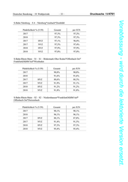 Deutscher Bundestag – 19. Wahlperiode – 33 – Drucksache 19/4761 Vorabfassung - wird durch die lektorierte Version ersetzt. S-Bahn Nürnberg – S 4 – Nürnberg*Ansbach*Dombühl Pünktlichkeit % (5:59) Gesamt per JUN 2017 97,3% 97,2% 2018 97,3% 97,3% 2017 HVZ 97,1% 96,8% 2017 NVZ 97,5% 97,4% 2018 HVZ 97,9% 97,9% 2018 NVZ 97,0% 97,0% S-Bahn Rhein-Main – S1 – S1 – Rödermark-Ober Roden*Offenbach Ost* Frankfurt(M)Hbf tief*Wiesbaden Pünktlichkeit % (5:59) Gesamt per JUN 2017 90,8% 90,0% 2018 91,6% 91,6% 2017 HVZ 88,6% 88,3% 2017 NVZ 91,9% 91,1% 2018 HVZ 91,2% 91,2% 2018 NVZ 91,8% 91,8% S-Bahn Rhein-Main – S2 – S2 – Niedernhausen*Frankfurt(M)Hbf tief* Offenbach Ost*Dietzenbach Pünktlichkeit % (5:59) Gesamt per JUN 2017 90,1% 90,1% 2018 96,1% 96,1% 2017 HVZ 88,1% 87,8% 2017 NVZ 91,4% 91,5% 2018 HVZ 97,3% 97,3% 2018 NVZ 95,4% 95,4%