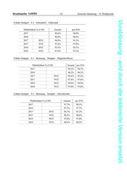 Deutscher Bundestag – 19. Wahlperiode – 43 – Drucksache 19/4761 Vorabfassung - wird durch die lektorierte Version ersetzt. S-Bahn Stuttgart – S 60 – Böblingen – Renningen – Stuttgart-Schwabstraße Pünktlichkeit % (5:59) Gesamt per JUN 2017 98,8% 99,0% 2018 98,6% 98,6% 2017 HVZ 98,0% 98,3% 2017 NVZ 99,2% 99,3% 2018 HVZ 98,1% 98,1% 2018 NVZ 98,8% 98,8% S-Bahn Stuttgart – S 6 Weil der Stadt – Stuttgart-Schwabstraße Pünktlichkeit % (5:59) Gesamt per JUN 2017 98,2% 98,4% 2018 97,9% 97,9% 2017 HVZ 97,0% 97,4% 2017 NVZ 98,8% 98,9% 2018 HVZ 97,1% 97,1% 2018 NVZ 98,3% 98,3% S-Bahn Stuttgart – S 5 – Bietigheim – Stuttgart-Schwabstraße Pünktlichkeit % (5:59) Gesamt per JUN 2017 97,6% 98,0% 2018 97,6% 97,6% 2017 HVZ 96,5% 97,0% 2017 NVZ 98,3% 98,6% 2018 HVZ 97,1% 97,1% 2018 NVZ 98,0% 98,0%