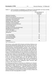 Drucksache 18/734 – 22 – Deutscher Bundestag – 18. Wahlperiode Tabelle 15: Anteil der Betriebe mit Maßnahmen zur Förderung der Chancengleichheit von Frauen und Män- nern, nach Branchen und Betriebsgrößenklassen 2012, in Prozent Anteil der Betriebe mit Maßnahmen in Prozent Öffentliche Verwaltung 64 Erziehung und Unterricht 56 Finanz- und Versicherungs-Dienstleistungen 47 Organisation ohne Erwerbszweck 44 Gesundheits- und Sozialwesen 44 Bergbau, Energie, Wasser, Abfall 38 Information und Kommunikation 35 Unternehmensnahe Dienstleistungen 33 Verarbeitendes Gewerbe 26 Handel und Reparatur 25 Sonstige Personennahe Dienstleistungen 23 Beherbergung und Gastronomie 20 Verkehr und Lagerei 20 Land- und Forstwirtschaft 20 Baugewerbe 15 1 bis 9 Beschäftigte 22 10 bis 49 Beschäftigte 42 50 bis 249 Beschäftigte 67 ab 250 Beschäftigte 86 Insgesamt 29 Quelle: IAB-Betriebspanel 2012. Neben diesem von der großen Zahl der kleineren und mittleren Einheiten in der deutschen Betriebslandschaft geprägten Bild lassen sich zum Stand der Fami- lienfreundlichkeit in der deutschen Wirtschaft weitere Hinweise aus dem „Un- ternehmensmonitor Familienfreundlichkeit“ gewinnen, einer Unternehmens- befragung des Instituts der deutschen Wirtschaft Köln im Auftrag des Bundes- ministeriums für Familie, Senioren, Frauen und Jugend (2003, 2006, 2010, 2013). Demnach schätzen über 80 Prozent der befragten Unternehmen die Be- deutung von Familienfreundlichkeit für sich mittlerweile als wichtig oder eher wichtig ein; das waren im Jahr 2003 mit knapp 47 Prozent noch deutlich weni- ger. Nach diesen Angaben ist seit dem Jahr 2003 die Zahl der Unternehmen mit besonders vielen verschiedenen familienfreundlichen Maßnahmen deutlich ge- stiegen: Der Anteil der Unternehmen, die 13 oder mehr Maßnahmen anbieten, ist mit gut acht Prozent deutlich höher als im Jahr 2003 (etwas mehr als 2 Prozent). Gut 15 Prozent der Unternehmen führen zehn bis zwölf Maßnahmen durch (2009: 17 Prozent; 2006: 15 Prozent; 2003: etwas über 3 Prozent) und weitere 27 Prozent sieben bis neun Maßnahmen (2009: 30 Prozent; 2006: 23 Prozent; 2003: etwas über 9 Prozent). Die Bundesregierung fördert die Unternehmen bei Maßnahmen der Gleichstel- lung im Betrieb. Knapp 100 Unternehmen beteiligen sich an dem vom Bundes- ministerium für Familie, Senioren, Frauen und Jugend geförderten Programm „Mehr Frauen in Führungspositionen – Regionale Bündnisse für Chancen- gleichheit“. Politik und Wirtschaft legen hierbei in zehn regionalen Bündnissen regionsspezifische Ziele fest und etablieren konkrete personalpolitische Instru- mente und Maßnahmen, um die Karriereentwicklung von Frauen zu fördern und Strukturen für mehr Chancengleichheit zu schaffen.