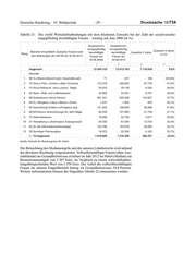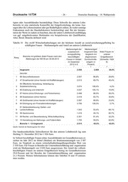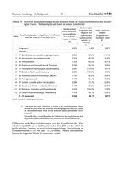 Deutscher Bundestag – 18. Wahlperiode – 29 – Drucksache 18/734 Tabelle 21: Die zwölf Wirtschaftsabteilungen mit dem höchstem Zuwachs bei der Zahl der sozialversiche- rungspflichtig beschäftigten Frauen – Anstieg seit Juni 2008 (in %) Sozialversich- Sozialversich- erungspflichtig erungspflichtig Branche mit größtem Zuwachs Frauen nach Zuwachs 5 Jahre Rang beschäftigte beschäftigte Zuwachs 5 Jahre den Abteilungen der WZ 08 am 30.06.2013 in v.H. Frauen am Frauen am 30.06.2008 30.06.2013 1 2 3 4 Insgesamt 12.394.125 13.513.163 1.119.038 9,0% darunter 1 98 H.v.Waren,Dienstl.d.priv. Haushalte oaS 71 237 166 233,8% 2 70 Verw.u.Führ. v.Untern.u.Betr.;Unt.berat. 172.076 259.852 87.776 51,0% 3 74 Sonst.freiberufl., wiss.u.techn. Tätigk. 20.810 29.136 8.326 40,0% 4 92 Spiel-, Wett- und Lotteriewesen 24.804 34.591 9.787 39,5% 5 88 Sozialwesen (ohne Heime) 381.431 525.358 143.927 37,7% 6 09 DL f.Bergbau u.Gew.v.Steine u.Erden 1.437 1.942 505 35,1% 7 82 Dienstleistg.f.Untern.u.Privatpers.ang 121.344 159.630 38.286 31,6% 8 66 M.Finanz-u.Versicherungs-DL verb.Tätigk. 80.249 101.985 21.736 27,1% 9 75 Veterinärwesen 18.088 22.759 4.671 25,8% 10 21 Herstellung v. pharmazeut. Erzeugnissen 54.530 67.264 12.734 23,4% 11 62 DL der Informationstechnologie 124.796 153.076 28.280 22,7% 12 30 Sonstiger Fahrzeugbau 18.373 22.536 4.163 22,7% 1 - 12 insgesamt 1.018.009 1.378.366 360.357 35,4% Quelle: Statistik der Bundesagentur für Arbeit Die Betrachtung des Medianentgelts und des unteren Lohnbereichs wird anhand der absoluten Rechnung vorgenommen. Vollzeitbeschäftigte Frauen (ohne Aus- zubildende) im Gesundheitswesen erzielten im Jahr 2012 im Mittel (Median) ein Bruttomonatsentgelt von 2 507 Euro, im Vergleich zu einem wirtschaftsabtei- lungsübergreifenden Wert von 2 558 Euro. Der Anteil der vollzeitbeschäftigten Frauen im unteren Entgeltbereich betrug im Gesundheitswesen 29,8 Prozent. Weitere Informationen können der folgenden Tabelle 22 entnommen werden.
