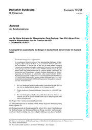 Deutscher Bundestag Drucksache 19/754 19. Wahlperiode 14.02.2018 Vorabfassung - wird durch die lektorierte Version ersetzt. Antwort der Bundesregierung auf die Kleine Anfrage der Abgeordneten René Springer, Uwe Witt, Jürgen Pohl, weiterer Abgeordneter und der Fraktion der AfD – Drucksache 19/562 – Kindergeld für ausländische EU-Bürger in Deutschland, deren Kinder im Ausland leben Vorbemerkung der Fragesteller In verschiedenen Medienberichten ist über unrechtmäßige Zahlungen von Kin- dergeld an EU-Ausländer für deren im Ausland lebende Kinder berichtet wor- den. So schreibt u. a. „welt.de“ am 30. Mai 2017 in einem Artikel von einem Anstieg von Leistungsmissbrauch in organisierter Form sowie dass sich die Zahl der begünstigten Kinder seit 2010 auf fast 170 000 verfünffacht habe. Darüber hinaus sollen dem Bundesministerium der Finanzen darüber Erkenntnisse aus Stichproben und Überprüfungen vorliegen. Geplante Maßnahmen der Bundes- regierung, den Missbrauch zu unterbinden, sollen wegen Bedenken der EU- Kommission eingestellt worden sein (www.welt.de/politik/deutschland/article 171106923/Mehr-Kinder-im-EU-Ausland-erhalten-Kindergeld.html; www.welt. de/politik/deutschland/article165058846/Organisierter-Betrug-bei-Kindergeld- fuer-EU-Auslaender.html). 1. Wie viel Kindergeld hat die Bundesrepublik Deutschland im Jahr 2017 an wie viele im Ausland lebende Kinder von EU-Bürgern gezahlt? 2. Welche konkreten Kindergeldzahlungen flossen dabei in welche EU-Staa- ten? 3. Wie viel Kindergeld hat die Bundesrepublik Deutschland im Zeitraum von 2010 bis 2016 an im Ausland lebende Kinder von EU-Bürgern gezahlt (bitte jährlich aufschlüsseln)? Die Fragen 1 bis 3 werden zusammen beantwortet. Zu den Zahlbeträgen für im Ausland lebende Kinder liegen der Bundesregierung keine Angaben vor. Die Bestandsstatistik der Bundesagentur für Arbeit (BA), deren Familienkassen für die Bearbeitung von Kindergeldfällen mit Bezug zum über- und zwischen- staatlichen Recht zuständig sind, weist lediglich Zahlungen aus, die auf ausländi- Die Antwort wurde namens der Bundesregierung mit Schreiben des Bundesministeriums der Finanzen vom 13. Februar 2018 übermittelt. Die Drucksache enthält zusätzlich – in kleinerer Schrifttype – den Fragetext.