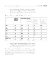 Deutscher Bundestag – 18. Wahlperiode – 13 – Drucksache 18/2565 8. Bei wie vielen Afghaninnen und Afghanen wurde seit dem 1. Januar 2006 ein Verfahren zur Prüfung des Widerrufs oder der Rücknahme der Asyl- oder Flüchtlingsanerkennung durch das Bundesamt für Migration und Flüchtlinge eingeleitet, wie viele Entscheidungen wurden getroffen, und in wie vielen Fällen wurde die Anerkennung widerrufen (bitte nach Jahren auflisten)? Die Angaben können der nachfolgenden Tabelle entnommen werden: eingeleitete Entscheidungen darunter: Widerrufs- Jahr verfahren insgesamt Widerruf/ Widerruf/ Widerruf/ Rücknahme Rücknahme Rücknahme Artikel 16a GG § 60 I § 60 II, III, V, AufenthG VII AufenthG 2006 619 634 60 134 406 2007 1 180 551 88 90 165 2008 3 773 3 765 30 121 53 2009 604 697 18 51 17 2010 411 611 20 24 23 2011 583 633 19 14 37 2012 542 558 6 26 36 2013 1 259 873 1 2 11 Jan-Jun 2014 479 864 2 3 13 Gesamt 9 450 9 186 244 465 761 9. Welche Erkenntnisse liegen der Bundesregierung zur Zahl der Personen vor, die infolge des Widerrufs oder der Rücknahme einer Asyl- oder Flüchtlingsanerkennung oder eines subsidiären bzw. Abschiebungsschut- zes ihren Aufenthaltstitel verloren haben bzw. die abgeschoben wurden (bitte nach Jahren auflisten)? Hierzu liegen keine gesicherten Erkenntnisse vor. Statistische Auswertungen von Daten des AZR lassen allenfalls in wenigen Einzelfällen die Vermutung zu, dass es infolge des Widerrufs oder der Rücknahme einer Asyl- oder Flüchtlings- anerkennung oder eines subsidiären Schutzes bzw. Abschiebungsschutzes zum Widerruf oder Erlöschen eines Aufenthaltstitels bzw. zu einer Abschiebung ge- kommen sein könnte.