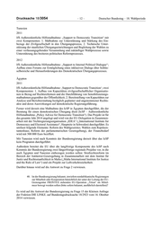 Drucksache 18/3054 – 12 – Deutscher Bundestag – 18. Wahlperiode Tunesien 2011 IfS Außerordentliche Hilfsmaßnahme: „Support to Democratic Transition“ mit zwei Komponenten: 1. Maßnahme zur Unterstützung und Stärkung des Ein- bezugs der Zivilgesellschaft in den Übergangsprozess, 2. Technische Unter- stützung der staatlichen Übergangseinrichtungen und Begleitung der Wahlen zu einer verfassungsgebenden Versammlung und zukünftiger Wahlprozesse sowie Unterstützung des breiteren politischen Reformprozesses. 2012 IfS Außerordentliche Hilfsmaßnahme: „Support to Internal Political Dialogue“; Aufbau eines Forums zur Ermöglichung eines inklusiven Dialogs über Schlüs- selbereiche und Herausforderungen des Demokratischen Übergangsprozesses. Ägypten 2011 IfS Außerordentliche Hilfsmaßnahme: ‚Support to Democratic Transition‘; zwei Komponenten: 1. Aufbau von Kapazitäten zivilgesellschaftlicher Organisatio- nen in Bezug auf Rechtsreformen und die Durchführung von Sensibilisierungs- maßnahmen gegenüber der Öffentlichkeit; 2. Bereitstellung von Kapazitäten zur Analyse und Berichterstattung bezüglich geplanter und angenommener Rechts- akte und deren Auswirkungen auf demokratische Regierungsführung. Ferner wird derzeit eine Maßnahme des IcSP in Ägypten durchgeführt, die der Beratung für einen demokratischen Übergang dient (IcSP – Außerordentliche Hilfsmaßnahme „Policy Advice for Democratic Transition“). Das Projekt ist für das gesamte Jahr 2014 angelegt und wird von der EU-Delegation in Zusammen- arbeit mit der Nichtregierungsorganisation „IDEA“ („International Institute for Democracy and Electoral Assistance“, Hauptsitz in Schweden) durchgeführt. Es umfasst folgende Elemente: Reform des Wahlgesetztes; Wahlen zum Repräsen- tantenhaus; Reform der parlamentarischen Gesetzgebung), der Finanzbedarf wird mit 500 000 Euro beziffert. Mit Tunesien wird nach Kenntnis der Bundesregierung derzeit über das IcSP kein Programm durchgeführt. Außerdem bereitet die EU über die langfristige Komponente des IcSP nach Kenntnis der Bundesregierung zwei längerfristige regionale Projekte vor, in die auch Ägypten und Tunesien einbezogen werden sollen: Strafrechtsreform im Bereich der Antiterror-Gesetzgebung in Zusammenarbeit mit dem Institut für Justiz und Rechtsstaatlichkeit in Malta („Malta International Institute for Justice and the Rule of Law“) und ein Projekt zur Luftverkehrssicherheit. Darüber hinaus wird auf die Antwort zu Frage 2 verwiesen. 40. Ist der Bundesregierung bekannt, inwiefern nordafrikanische Regierungen zur Mitarbeit oder Kooperation hinsichtlich der unter der Leitung der EU- Grenzagentur FRONTEX stehenden EU-Operation „Triton“ im Mittel- meer bewegt werden sollen (bitte sofern bekannt, ausführlich darstellen)? Es wird auf die Antwort der Bundesregierung zu Frage 15 der Kleinen Anfrage der Fraktion DIE LINKE. auf Bundestagsdrucksache 18/2923 vom 14. Oktober 2014 verwiesen.