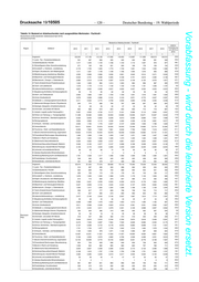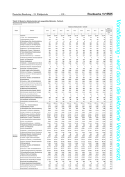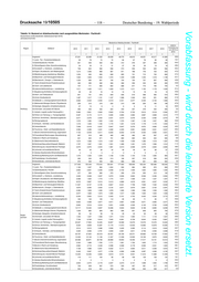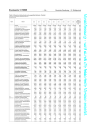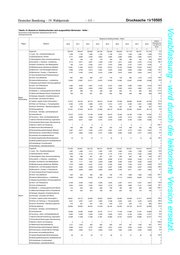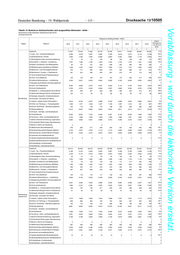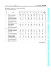 Drucksache 19/10505 – 116 – Deutscher Bundestag – 19. Wahlperiode Vorabfassung - wird durch die lektorierte Version ersetzt. Tabelle 14: Bestand an Arbeitsuchenden nach ausgewählten Merkmalen - Fachkraft - Deutschland und Bundesländer (Gebietsstand April 2019) Jahresdurchschnitte Bestand an Arbeitsuchenden - Fachkraft - relative Region Zielberuf Veränderung 2010 2011 2012 2013 2014 2015 2016 2017 2018 von 2010 zu 2018 1 2 3 4 5 6 7 8 9 11 Insgesamt 2.490.951 2.169.059 2.000.607 2.060.786 2.004.652 1.890.109 1.832.269 1.734.053 1.579.660 -36,6 11,Land-, Tier-, Forstwirtschaftsberufe 15.645 12.849 11.967 11.108 10.176 9.335 9.096 8.420 7.217 -53,9 12,Gartenbauberufe, Floristik 36.963 31.613 27.559 26.684 24.595 22.140 19.935 17.601 15.239 -58,8 21,Rohstoffgewinn,Glas-,Keramikverarbeitung 5.629 4.126 3.795 3.845 3.561 3.324 3.060 2.746 2.375 -57,8 22,Kunststoff- u. Holzherst.,-verarbeitung 43.925 34.316 30.851 32.874 30.764 28.449 26.431 24.569 21.563 -50,9 23,Papier-,Druckberufe, tech.Mediengestalt. 28.288 24.629 22.438 22.796 21.756 19.666 18.434 16.938 15.033 -46,9 24,Metallerzeugung,-bearbeitung, Metallbau 106.337 71.601 62.245 66.700 60.114 55.481 53.073 46.179 38.486 -63,8 25,Maschinen- und Fahrzeugtechnikberufe 137.601 104.596 102.469 110.765 103.532 97.382 93.632 85.252 76.468 -44,4 26,Mechatronik-, Energie- u. Elektroberufe 53.235 38.962 33.819 35.287 33.406 30.836 30.968 29.083 25.303 -52,5 27,Techn.Entwickl.Konstr.Produktionssteuer. 26.350 21.316 19.589 20.393 20.081 19.260 18.640 17.392 16.098 -38,9 28,Textil- und Lederberufe 26.965 22.893 20.812 20.777 19.594 18.148 18.722 19.256 17.462 -35,2 29,Lebensmittelherstellung u. -verarbeitung 77.743 69.140 62.148 62.651 59.925 54.999 51.407 47.785 42.256 -45,6 31,Bauplanung,Architektur,Vermessungsberufe 2.110 1.754 1.410 1.352 1.210 1.053 967 977 901 -57,3 32,Hoch- und Tiefbauberufe 75.928 58.585 51.343 51.491 47.565 42.833 37.308 31.959 26.250 -65,4 33,(Innen-)Ausbauberufe 88.779 71.822 63.821 65.461 61.013 56.029 50.455 44.781 38.367 -56,8 34,Gebäude- u. versorgungstechnische Berufe 143.355 135.421 128.046 131.689 129.255 123.191 115.414 107.785 98.000 -31,6 41,Mathematik-Biologie-Chemie-,Physikberufe 11.447 9.326 8.454 8.907 8.952 8.583 8.474 8.216 7.546 -34,1 42,Geologie-,Geografie-,Umweltschutzberufe 919 699 608 570 552 540 572 625 557 -39,4 Deutschland 43,Informatik- und andere IKT-Berufe 15.647 13.027 10.993 11.038 10.958 11.129 11.346 11.158 10.436 -33,3 51,Verkehr, Logistik (außer Fahrzeugführ.) 86.850 74.693 71.706 76.083 75.375 72.582 69.299 65.261 60.034 -30,9 52,Führer von Fahrzeug- u. Transportgeräten 215.862 190.522 176.611 183.142 179.682 172.494 165.918 159.932 149.693 -30,7 53,Schutz-,Sicherheits-, Überwachungsberufe 107.234 108.812 108.045 115.391 121.108 120.658 124.819 133.368 134.551 25,5 54,Reinigungsberufe 50.942 48.810 48.020 49.575 48.484 45.385 42.218 38.860 34.554 -32,2 61,Einkaufs-, Vertriebs- und Handelsberufe 32.162 28.030 26.713 29.099 30.449 29.097 27.577 25.860 23.374 -27,3 62,Verkaufsberufe 326.711 289.684 265.681 268.611 256.816 234.273 216.535 199.188 176.312 -46,0 63,Tourismus-, Hotel- und Gaststättenberufe 137.027 129.428 119.511 122.483 121.202 114.517 110.397 105.605 95.070 -30,6 71,Berufe Unternehmensführung,-organisation 298.005 259.722 235.813 238.791 231.066 213.445 196.259 179.991 161.479 -45,8 72,Finanzdienstl.Rechnungsw.,Steuerberatung 21.099 18.126 16.053 16.590 17.078 16.957 17.180 16.820 14.907 -29,3 73,Berufe in Recht und Verwaltung 27.747 25.467 23.464 23.499 23.166 22.291 21.596 20.989 19.492 -29,8 81,Medizinische Gesundheitsberufe 73.008 65.412 58.888 59.907 59.023 54.978 52.994 51.016 47.419 -35,1 82,Nichtmed.Gesundheit,Körperpfl.,Medizint. 61.190 56.077 50.872 52.194 51.243 48.657 48.230 47.250 43.899 -28,3 83,Erziehung,soz.,hauswirt.Berufe,Theologie 101.168 97.573 89.846 92.546 93.013 94.123 123.072 122.483 117.355 16,0 84,Lehrende und ausbildende Berufe 1.374 1.309 1.192 1.193 1.185 1.286 1.539 1.615 1.560 13,6 91,Geistes-Gesellschafts-Wirtschaftswissen. 42 44 35 39 43 37 28 34 26 -37,5 92,Werbung,Marketing,kaufm,red.Medienberufe 34.817 31.538 29.964 30.680 30.844 29.650 28.245 26.421 24.489 -29,7 93,Produktdesign, Kunsthandwerk 9.691 8.248 7.068 7.152 6.798 6.374 6.965 7.356 5.591 -42,3 94,Darstellende, unterhaltende Berufe 9.061 8.817 8.660 9.269 10.898 10.777 11.275 11.099 10.142 11,9 Insgesamt 1.603.433 1.405.236 1.311.192 1.375.927 1.359.078 1.306.006 1.292.830 1.245.141 1.148.558 -28,4 11,Land-, Tier-, Forstwirtschaftsberufe 5.400 4.597 4.893 4.482 4.239 4.216 4.240 4.169 3.785 -29,9 12,Gartenbauberufe, Floristik 17.719 15.719 14.254 14.195 13.351 12.459 11.687 10.691 9.540 -46,2 21,Rohstoffgewinn,Glas-,Keramikverarbeitung 3.092 2.303 2.163 2.201 2.112 2.060 1.954 1.816 1.601 -48,2 22,Kunststoff- u. Holzherst.,-verarbeitung 27.558 21.405 19.625 21.698 20.891 19.784 18.825 17.916 15.954 -42,1 23,Papier-,Druckberufe, tech.Mediengestalt. 18.850 16.367 14.959 15.387 14.740 13.436 12.863 11.985 10.752 -43,0 24,Metallerzeugung,-bearbeitung, Metallbau 71.575 47.953 42.201 46.125 42.778 40.702 39.995 35.265 29.556 -58,7 25,Maschinen- und Fahrzeugtechnikberufe 100.484 75.876 74.508 81.445 77.490 74.323 72.594 66.830 60.150 -40,1 26,Mechatronik-, Energie- u. Elektroberufe 35.744 26.156 22.929 24.374 23.699 22.369 22.980 21.916 19.220 -46,2 27,Techn.Entwickl.Konstr.Produktionssteuer. 19.925 16.129 14.855 15.600 15.648 15.226 14.936 14.051 13.038 -34,6 28,Textil- und Lederberufe 17.257 14.756 13.403 13.670 13.113 12.421 13.305 14.123 12.962 -24,9 29,Lebensmittelherstellung u. -verarbeitung 43.362 39.356 36.427 38.152 37.341 35.383 34.270 32.657 29.401 -32,2 31,Bauplanung,Architektur,Vermessungsberufe 1.051 880 691 705 641 555 550 600 583 -44,5 32,Hoch- und Tiefbauberufe 32.101 26.084 24.163 25.319 24.624 23.543 21.574 19.400 16.452 -48,7 33,(Innen-)Ausbauberufe 46.930 39.100 36.154 38.652 37.557 35.728 33.493 30.853 27.100 -42,3 34,Gebäude- u. versorgungstechnisch