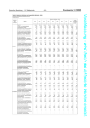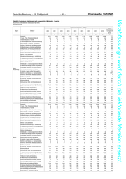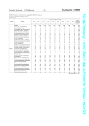 Drucksache 19/10505 – 84 – Deutscher Bundestag – 19. Wahlperiode Vorabfassung - wird durch die lektorierte Version ersetzt. Tabelle 8: Bestand an Arbeitslosen nach ausgewählten Merkmalen - Experte - Deutschland und Bundesländer (Gebietsstand April 2019) Jahresdurchschnitte Bestand an Arbeitslosen - Experte - relative Region Zielberuf Veränderung 2010 2011 2012 2013 2014 2015 2016 2017 2018 von 2010 zu 2018 1 2 3 4 5 6 7 8 9 11 Insgesamt 10.670 9.457 8.905 9.296 9.564 9.474 8.222 7.584 6.897 -35,4 11,Land-, Tier-, Forstwirtschaftsberufe 138 137 120 113 101 121 103 99 83 -39,4 12,Gartenbauberufe, Floristik 104 101 77 66 66 53 50 37 29 -72,4 21,Rohstoffgewinn,Glas-,Keramikverarbeitung 11 9 3 3 3 6 4 6 4 -63,6 22,Kunststoff- u. Holzherst.,-verarbeitung 28 20 21 19 21 19 20 16 13 -54,8 23,Papier-,Druckberufe, tech.Mediengestalt. 141 125 115 122 113 104 87 73 61 -57,1 24,Metallerzeugung,-bearbeitung, Metallbau 40 35 25 25 28 37 21 19 16 -61,4 25,Maschinen- und Fahrzeugtechnikberufe 389 245 189 234 276 283 263 241 200 -48,5 26,Mechatronik-, Energie- u. Elektroberufe 430 295 232 240 259 267 250 201 150 -65,2 27,Techn.Entwickl.Konstr.Produktionssteuer. 648 486 435 527 563 517 476 432 395 -39,0 28,Textil- und Lederberufe 66 55 50 47 45 44 31 29 31 -52,8 29,Lebensmittelherstellung u. -verarbeitung 83 61 58 72 61 58 49 49 40 -51,4 31,Bauplanung,Architektur,Vermessungsberufe 787 648 597 564 509 480 407 356 309 -60,7 32,Hoch- und Tiefbauberufe 164 116 94 96 77 79 62 57 51 -69,2 33,(Innen-)Ausbauberufe - - - - - - - - - x 34,Gebäude- u. versorgungstechnische Berufe 85 62 56 59 49 54 35 28 25 -70,6 41,Mathematik-Biologie-Chemie-,Physikberufe 546 531 538 617 693 793 657 566 472 -13,5 42,Geologie-,Geografie-,Umweltschutzberufe 251 239 226 237 269 285 238 202 185 -26,1 Sachsen 43,Informatik- und andere IKT-Berufe 337 276 259 298 321 344 289 291 275 -18,4 51,Verkehr, Logistik (außer Fahrzeugführ.) 231 178 167 190 195 171 144 126 115 -50,1 52,Führer von Fahrzeug- u. Transportgeräten 5 5 5 4 5 4 5 7 5 -5,0 53,Schutz-,Sicherheits-, Überwachungsberufe 23 14 14 12 16 16 28 28 20 -14,9 54,Reinigungsberufe - - - - - - - - - x 61,Einkaufs-, Vertriebs- und Handelsberufe 348 313 312 339 390 398 368 343 340 -2,3 62,Verkaufsberufe 340 288 347 295 243 181 141 137 123 -64,0 63,Tourismus-, Hotel- und Gaststättenberufe 381 366 301 284 281 259 211 202 179 -53,0 71,Berufe Unternehmensführung,-organisation 1.218 1.105 1.028 1.062 1.033 1.028 949 841 800 -34,4 72,Finanzdienstl.Rechnungsw.,Steuerberatung 222 218 210 221 257 245 222 187 167 -24,7 73,Berufe in Recht und Verwaltung 346 337 289 290 290 314 282 269 241 -30,3 81,Medizinische Gesundheitsberufe 370 364 402 439 478 508 511 537 548 48,1 82,Nichtmed.Gesundheit,Körperpfl.,Medizint. 56 60 72 79 82 82 65 72 70 25,1 83,Erziehung,soz.,hauswirt.Berufe,Theologie 355 360 351 370 423 409 279 293 305 -14,3 84,Lehrende und ausbildende Berufe 958 904 834 846 900 879 777 754 708 -26,1 91,Geistes-Gesellschafts-Wirtschaftswissen. 903 920 929 912 895 840 657 583 479 -47,0 92,Werbung,Marketing,kaufm,red.Medienberufe 182 183 182 213 207 215 192 166 145 -20,4 93,Produktdesign, Kunsthandwerk 96 111 96 110 115 117 116 117 102 6,2 94,Darstellende, unterhaltende Berufe 387 292 271 292 301 265 234 223 211 -45,6 Insgesamt 4.245 3.846 3.896 3.982 4.121 3.874 3.373 3.021 2.836 -33,2 11,Land-, Tier-, Forstwirtschaftsberufe 85 64 63 72 74 64 63 54 48 -43,9 12,Gartenbauberufe, Floristik 28 24 21 20 20 18 17 13 11 -62,9 21,Rohstoffgewinn,Glas-,Keramikverarbeitung 2 1 0 1 3 2 1 3 2 11,5 22,Kunststoff- u. Holzherst.,-verarbeitung 9 5 3 5 6 8 6 6 3 -61,0 23,Papier-,Druckberufe, tech.Mediengestalt. 24 32 29 27 32 31 23 22 15 -37,5 24,Metallerzeugung,-bearbeitung, Metallbau 22 18 18 24 26 29 27 19 17 -23,1 25,Maschinen- und Fahrzeugtechnikberufe 204 136 130 129 135 133 132 112 92 -54,8 26,Mechatronik-, Energie- u. Elektroberufe 141 110 97 111 115 106 105 64 61 -56,7 27,Techn.Entwickl.Konstr.Produktionssteuer. 267 238 223 241 267 260 239 197 158 -40,8 28,Textil- und Lederberufe 15 13 11 10 10 10 10 10 9 -43,0 29,Lebensmittelherstellung u. -verarbeitung 45 39 44 43 43 38 33 27 29 -35,1 31,Bauplanung,Architektur,Vermessungsberufe 354 283 271 256 222 186 173 159 127 -64,2 32,Hoch- und Tiefbauberufe 113 93 73 64 65 60 47 45 38 -66,0 33,(Innen-)Ausbauberufe - - - - - - - - - x 34,Gebäude- u. versorgungstechnische Berufe 32 36 28 26 26 25 16 14 12 -63,8 41,Mathematik-Biologie-Chemie-,Physikberufe 244 228 260 300 322 331 291 223 207 -15,0 42,Geologie-,Geografie-,Umweltschutzberufe 53 46 53 63 66 74 66 57 42 -20,3 Sachsen- 43,Informatik- und andere IKT-Berufe 109 81 88 84 93 103 98 93 88 -19,3 Anhalt 51,Verkehr, Logistik (außer Fahrzeugführ.) 110 80 70 79 84 82 80 66 48 -57,0 52,Führer von Fahrzeug- u. Transportgeräten 2 2 3 2 2 3 2 4 3 38,5 53,Schutz-,Sicherheits-, Überwachungsberufe 14 13 12 10 9 12 21 15 16 15,9 54,Reinigungsberufe - - - - - - - - - x 61,Einkaufs-, Vertriebs- und Handelsberufe 133 121 136 136 135 127 134 128 131 -1,8 62,Verkaufsberufe 197 163 202 178 144 104 71 63 62 -68,3 63,Tourismus-, Hotel- und Gaststättenberufe 131 104 99 106 104 91 73 78 74 -43,4 71,Berufe Unternehmensführung,-organisation 526 485 466 492 539 469 414 388 398 -24,3 72,Finanzdienstl.Rechnungsw.,Steuerberatung 89 80 83 97 112 100 93 78 64 -28,1 73,Berufe in Recht und Verwaltung 136 133 122 124 117 125 85 81 85 -37,0 81,Medizinische Gesundheitsberufe 137 130 148 159 188 185 166 176 197 43,9 82,Nichtmed.Gesundheit,Körperpfl.,Medizint. 51 54 52 51 47 46 37 34 32 -37,4 83,Erziehung,soz.,hauswirt.Berufe,Theologie 163 198 206 177 197 172 126 131 125 -23,2 84,Lehrende und ausbildende Berufe 376 383 421 415 404 380 304 282 297 -21,0 91,Geistes-Gesellschafts-Wirtschaftswissen. 233 270 311 300 322 308 250 219 191 -17,7 92,Werbung,Marketing,kaufm,red.Medienberufe 64 66 49 66 69 72 65 55 50 -22,5 93,Produktdesign, Kunsthandwerk 48 47 37 44 51 53 48 51 41 -14,2 94,Darstellende, unterhaltende Berufe 91 72 69 72 73