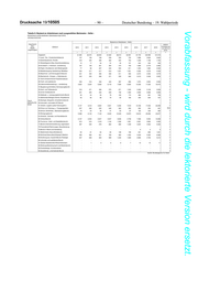 Deutscher Bundestag – 19. Wahlperiode – 83 – Drucksache 19/10505 Vorabfassung - wird durch die lektorierte Version ersetzt. Tabelle 8: Bestand an Arbeitslosen nach ausgewählten Merkmalen - Experte - Deutschland und Bundesländer (Gebietsstand April 2019) Jahresdurchschnitte Bestand an Arbeitslosen - Experte - relative Region Zielberuf Veränderung 2010 2011 2012 2013 2014 2015 2016 2017 2018 von 2010 zu 2018 1 2 3 4 5 6 7 8 9 11 Insgesamt 4.801 4.494 4.379 4.589 4.595 4.262 4.007 3.691 3.476 -27,6 11,Land-, Tier-, Forstwirtschaftsberufe 116 97 91 103 98 92 92 72 68 -41,6 12,Gartenbauberufe, Floristik 44 43 35 33 27 28 25 21 17 -62,6 21,Rohstoffgewinn,Glas-,Keramikverarbeitung 17 7 2 2 3 3 2 2 2 -86,8 22,Kunststoff- u. Holzherst.,-verarbeitung 8 8 9 7 9 6 7 6 4 -56,3 23,Papier-,Druckberufe, tech.Mediengestalt. 41 40 43 39 43 40 33 39 30 -28,3 24,Metallerzeugung,-bearbeitung, Metallbau 22 22 15 21 19 20 15 10 8 -63,0 25,Maschinen- und Fahrzeugtechnikberufe 160 118 106 114 123 133 123 113 90 -43,4 26,Mechatronik-, Energie- u. Elektroberufe 178 137 107 113 102 97 94 74 69 -61,1 27,Techn.Entwickl.Konstr.Produktionssteuer. 238 213 219 231 244 238 204 173 142 -40,3 28,Textil- und Lederberufe 6 7 7 8 5 6 10 12 8 37,0 29,Lebensmittelherstellung u. -verarbeitung 51 43 45 51 49 45 43 32 28 -44,1 31,Bauplanung,Architektur,Vermessungsberufe 479 427 390 354 338 285 257 188 175 -63,5 32,Hoch- und Tiefbauberufe 112 87 66 68 64 58 46 45 35 -69,1 33,(Innen-)Ausbauberufe - - - - - - - - - x 34,Gebäude- u. versorgungstechnische Berufe 28 35 22 19 15 15 15 13 11 -61,0 41,Mathematik-Biologie-Chemie-,Physikberufe 193 199 209 226 234 231 232 220 185 -4,1 42,Geologie-,Geografie-,Umweltschutzberufe 80 80 86 91 101 98 102 93 80 -0,4 Brandenburg 43,Informatik- und andere IKT-Berufe 157 118 126 156 167 153 159 154 161 2,0 51,Verkehr, Logistik (außer Fahrzeugführ.) 115 92 81 90 93 79 66 62 65 -43,9 52,Führer von Fahrzeug- u. Transportgeräten 4 2 4 5 6 7 3 7 8 95,7 53,Schutz-,Sicherheits-, Überwachungsberufe 11 11 11 8 11 8 17 19 14 22,2 54,Reinigungsberufe - - - - - - - - - x 61,Einkaufs-, Vertriebs- und Handelsberufe 196 175 199 226 234 218 239 244 207 5,6 62,Verkaufsberufe 191 170 224 209 154 105 97 88 67 -65,2 63,Tourismus-, Hotel- und Gaststättenberufe 169 164 151 169 161 151 129 110 113 -33,4 71,Berufe Unternehmensführung,-organisation 642 606 589 634 624 576 513 482 479 -25,3 72,Finanzdienstl.Rechnungsw.,Steuerberatung 117 109 117 141 138 129 125 111 106 -9,2 73,Berufe in Recht und Verwaltung 191 202 176 169 179 155 146 135 128 -32,9 81,Medizinische Gesundheitsberufe 156 170 172 181 199 199 231 230 233 49,6 82,Nichtmed.Gesundheit,Körperpfl.,Medizint. 24 28 32 35 38 38 33 24 24 -2,1 83,Erziehung,soz.,hauswirt.Berufe,Theologie 216 227 207 221 224 192 159 147 154 -28,9 84,Lehrende und ausbildende Berufe 388 398 398 396 400 375 359 352 396 1,9 91,Geistes-Gesellschafts-Wirtschaftswissen. 179 203 210 223 229 212 192 182 162 -9,6 92,Werbung,Marketing,kaufm,red.Medienberufe 91 94 92 106 122 120 97 99 90 -2,0 93,Produktdesign, Kunsthandwerk 20 27 23 29 28 27 24 20 21 4,2 94,Darstellende, unterhaltende Berufe 160 137 115 112 113 120 117 111 99 -37,9 Insgesamt 3.348 3.198 3.083 3.043 3.122 2.983 2.717 2.439 2.281 -31,9 11,Land-, Tier-, Forstwirtschaftsberufe 100 94 89 76 87 66 71 63 57 -42,5 12,Gartenbauberufe, Floristik 37 30 28 23 25 21 14 12 11 -69,0 21,Rohstoffgewinn,Glas-,Keramikverarbeitung 1 - 1 0 - 1 2 1 1 -40,0 22,Kunststoff- u. Holzherst.,-verarbeitung 4 2 3 4 4 2 2 3 2 -55,8 23,Papier-,Druckberufe, tech.Mediengestalt. 23 14 19 15 16 18 15 11 17 -28,1 24,Metallerzeugung,-bearbeitung, Metallbau 13 10 7 10 13 12 11 10 7 -49,7 25,Maschinen- und Fahrzeugtechnikberufe 124 97 82 84 101 99 98 82 65 -47,5 26,Mechatronik-, Energie- u. Elektroberufe 71 71 66 68 76 67 66 57 47 -34,1 27,Techn.Entwickl.Konstr.Produktionssteuer. 136 113 131 139 145 140 123 106 90 -33,8 28,Textil- und Lederberufe 2 3 3 3 5 3 3 3 2 -8,3 29,Lebensmittelherstellung u. -verarbeitung 45 46 49 54 47 42 42 39 44 -2,8 31,Bauplanung,Architektur,Vermessungsberufe 258 203 194 213 192 173 148 108 97 -62,4 32,Hoch- und Tiefbauberufe 73 60 45 35 35 38 39 37 31 -57,1 33,(Innen-)Ausbauberufe - - - - - - - - - x 34,Gebäude- u. versorgungstechnische Berufe 21 19 17 12 9 11 10 8 7 -66,8 41,Mathematik-Biologie-Chemie-,Physikberufe 158 151 161 177 190 215 200 164 155 -2,0 42,Geologie-,Geografie-,Umweltschutzberufe 36 37 40 47 52 67 54 50 41 13,6 Mecklenburg- 43,Informatik- und andere IKT-Berufe 87 82 65 74 85 77 82 67 64 -26,7 Vorpommern 51,Verkehr, Logistik (außer Fahrzeugführ.) 84 81 76 74 80 68 70 74 58 -31,5 52,Führer von Fahrzeug- u. Transportgeräten 15 17 17 25 31 29 26 31 35 126,2 53,Schutz-,Sicherheits-, Überwachungsberufe 9 8 8 7 5 4 13 12 11 25,0 54,Reinigungsberufe - - - - - - - - - x 61,Einkaufs-, Vertriebs- und Handelsberufe 89 81 88 90 98 96 102 93 85 -4,1 62,Verkaufsberufe 110 102 135 128 95 81 71 65 60 -45,5 63,Tourismus-, Hotel- und Gaststättenberufe 141 140 133 121 111 104 93 74 73 -47,8 71,Berufe Unternehmensführung,-organisation 349 373 346 331 354 342 306 289 283 -18,8 72,Finanzdienstl.Rechnungsw.,Steuerberatung 63 59 64 75 79 77 68 64 59 -6,0 73,Berufe in Recht und Verwaltung 109 121 111 104 101 98 88 76 61 -44,2 81,Medizinische Gesundheitsberufe 109 105 104 120 125 134 138 166 179 64,8 82,Nichtmed.Gesundheit,Körperpfl.,Medizint. 16 20 21 22 25 25 21 17 16 1,6 83,Erziehung,soz.,hauswirt.Berufe,Theologie 184 181 151 153 148 122 97 115 112 -39,3 84,Lehrende und ausbildende Berufe 576 592 560 499 500 467 391 331 307 -46,7 91,Geistes-Gesellschafts-Wirtschaftswissen. 163 159 145 139 153 139 121 111 98 -39,8 92,Werbung,Marketing,kaufm,red.Medienberufe 49 51 45 49 59 73 58 48 49 -0,8 93,Produktdesign, Kunsthandwerk 24 24 22 22 24 26 28 20 20 -14,7 94,Darstellende, unterhaltende Berufe 71 52 56 51 53 47 47 38 38 -46,6