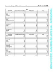 Deutscher Bundestag – 19. Wahlperiode – 69 – Drucksache 19/1226 Vorabfassung - wird durch die lektorierte Version ersetzt. 2014 Bundesland Ordnungswidrigkeitenverfahren Strafverfahren Gesamt Baden-Württemberg 1.638 1.298 2.936 Bayern 2.645 1.318 3.963 Berlin 238 182 420 Brandenburg 492 283 775 Bremen 324 133 457 Hamburg 126 94 220 Hessen 673 771 1.444 Mecklenburg-Vorpommern 368 233 601 Niedersachsen 1.155 735 1.890 Nordrhein-Westfalen 2.079 1.903 3.982 Rheinland-Pfalz 695 460 1.155 Saarland 80 200 280 Sachsen 557 718 1.275 Sachsen-Anhalt 291 242 533 Schleswig-Holstein 674 374 1.048 Thüringen 447 268 715 Gesamt 12.482 9.212 21.694 2015 Bundesland Ordnungswidrigkeitenverfahren Strafverfahren Gesamt Baden-Württemberg 930 1.055 1.985 Bayern 1.067 1.259 2.326 Berlin 95 275 370 Brandenburg 290 315 605 Bremen 192 106 298 Hamburg 94 82 176 Hessen 427 680 1.107 Mecklenburg-Vorpommern 210 433 643 Niedersachsen 607 718 1.325 Nordrhein-Westfalen 1.209 2.190 3.399 Rheinland-Pfalz 545 438 983 Saarland 43 302 345 Sachsen 322 750 1.072 Sachsen-Anhalt 178 186 364 Schleswig-Holstein 228 257 485 Thüringen 225 291 516 Gesamt 6.662 9.337 15.999