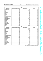 Drucksache 19/1226 – 70 – Deutscher Bundestag – 19. Wahlperiode Vorabfassung - wird durch die lektorierte Version ersetzt. 2016 Bundesland Ordnungswidrigkeitenverfahren Strafverfahren Gesamt Baden-Württemberg 780 979 1.759 Bayern 857 1.240 2.097 Berlin 153 285 438 Brandenburg 208 306 514 Bremen 114 158 272 Hamburg 79 83 162 Hessen 384 610 994 Mecklenburg-Vorpommern 119 107 226 Niedersachsen 668 650 1.318 Nordrhein-Westfalen 1.041 1.807 2.848 Rheinland-Pfalz 348 370 718 Saarland 36 262 298 Sachsen 320 725 1.045 Sachsen-Anhalt 180 221 401 Schleswig-Holstein 127 324 451 Thüringen 230 327 557 Gesamt 5.644 8.454 14.098 2017 Bundesland Ordnungswidrigkeitenverfahren Strafverfahren Gesamt Baden-Württemberg 744 1.054 1.798 Bayern 812 1.272 2.084 Berlin 135 234 369 Brandenburg 205 243 448 Bremen 103 132 235 Hamburg 128 97 225 Hessen 407 845 1.252 Mecklenburg-Vorpommern 123 117 240 Niedersachsen 544 565 1.109 Nordrhein-Westfalen 1.200 1.979 3.179 Rheinland-Pfalz 333 648 981 Saarland 48 225 273 Sachsen 269 712 981 Sachsen-Anhalt 205 266 471 Schleswig-Holstein 106 284 390 Thüringen 196 323 519 Gesamt 5.558 8.996 14.554 Quelle: Finanzkontrolle Schwarzarbeit der Zollverwaltung