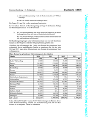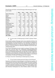 Deutscher Bundestag – 18. Wahlperiode –9– Drucksache 18/8570 Vorabfassung - wird durch die lektorierte Version ersetzt. c) Auf welcher Datengrundlage wurde der Baukostendeckel auf 3 000 Euro festgelegt? d) Gab es im Vorfeld statistische Erhebungen dazu? Die Fragen 24 c und 24d werden gemeinsam beantwortet. Es wird auf die Antwort der Bundesregierung zu Frage 14 der Kleinen Anfrage auf Bundestagsdrucksache 18/8378 verwiesen. 25. Wie viele Sozialwohnungen sind in den letzten fünf Jahren aus der Sozial- bindung gefallen (bitte nach Jahr und Bundesland aufschlüsseln)? Wie viele Sozialwohnungen wurden im selben Zeitraum errichtet (bitte nach Jahr und Bundesland aufschlüsseln)? Der Bundesregierung liegen keine Informationen dazu vor, wie viele Sozialwoh- nungen aus der Mietpreis- und/oder Belegungsbindung gefallen sind. Allerdings gibt es Schätzungen der Länder zum Bestand der gebundenen Miet- wohnungen, die der nachfolgenden Tabelle zu entnehmen sind. Für die Jahre 2014 und 2015 liegen keine Informationen zum Bestand der gebundenen Miet- wohnungen vor. Tab.: Bestand an gebundenen Mietwohnungen in den Ländern Länder 2010 2011 2012 2013 WE WE WE WE Baden-Württemberg 65.000 58.000 56.000 53.000 Bayern 161.000 159.000 158.000 150.500 Berlin 213.442 208.541 200.854 194.413 Brandenburg 39.700 38.400 39.300 65.819 Bremen 10.196 9.659 9.356 9.271 Hamburg 108.011 105.040 109.005 102.998 Hessen 127.910 123.028 120.534 115.325 Mecklenburg-Vorpommern 7.296 7.198 7.364 7.190 Niedersachsen 84.755 83.498 97.237 94.743 Nordrhein-Westfalen 543.983 527.276 513.901 499.063 Rheinland-Pfalz 61.732 58.451 53.134 49.427 Saarland 2.500 2.500 2.300 2.300 Sachsen 83.303 k.A. 42.505 7.026 Sachsen-Anhalt 31.298 k.A. 28.359 25.452 Schleswig-Holstein 66.931 64.810 63.866 63.846 Thüringen 55.090 45.299 37.027 34.861 alle Länder 1.662.147 1.490.700 1.538.742 1.475.234 In den Jahren 2010 bis 2014 wurden 56.619 Mietwohnungen im Rahmen der so- zialen Wohnraumförderung errichtet. Die Aufschlüsselung nach Jahr und Bun- desland ist der folgenden Tabelle zu entnehmen.