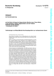 Deutscher Bundestag Drucksache 18/12772 18. Wahlperiode 20.06.2017 Vorabfassung - wird durch die lektorierte Version ersetzt. Antwort der Bundesregierung auf die Kleine Anfrage der Abgeordneten Monika Lazar, Özcan Mutlu, Luise Amtsberg, weiterer Abgeordneter und der Fraktion BÜNDNIS 90/DIE GRÜNEN – Drucksache 18/12644 – Verbindungen von Mixed-Martial-Arts-Kampfsportlern zur rechtsextremen Szene Vorbemerkung der Fragesteller Mixed Martial Arts (MMA) ist eine Vollkontaktsportart, die mehrere Kampf- techniken vereint. MMA erhielt in den letzten Jahren auch in Deutschland wach- senden Zulauf. MMA ist umstritten. Im Jahr 2010 forderte die Bundesärztekammer ein Verbot aller „Ultimate Fighting“-Events (Kampfserie eines US-MMA-Verbandes) in Deutschland, da das Ziel bei MMA „anders als in allen anderen Kampfsportar- ten, offen und ausschließlich die Verletzung des Gegners an Körper, Gesundheit und Leben“ sei (vgl. www.welt.de/sport/article145458446/Nichts-fuer-Assis- die-Rentner-ins-Koma-pruegeln.html). Die bayerische Landeszentrale für neue Medien verbot im Jahr 2010 eine Übertragung im deutschen Fernsehen. Dieses Verbot wurde im Jahr 2014 gerichtlich gekippt. Neben der kontroversen Kampfmethoden, steht MMA auch immer wieder we- gen der Verbindungen einzelner Kämpfer zur rechtsextremen Szene in der Dis- kussion. Bei einem organisierten Angriff von Rechtsextremen auf das Leipziger Stadtviertel Connewitz am 11. Januar 2016 waren neben Hooligans verschiede- ner Fanszenen und Mitgliedern rechtsextremer Parteien und Kameradschaften auch einige sogenannte Freefight-Kämpfer aus dem „Imperium Fight Team“ des Kämpfers Benjamin Brinsa dabei, die der MMA-Szene angehören (vgl. http://transparent-magazin.de/blog/wie-politik-und-fussball-leipzig-spalten/ und www.mdr.de/exakt/hooligan-liste-100.html). Benjamin Brinsa wird vorge- worfen, Verbindungen in die rechtsextreme Szene und die Hooligan-Szene zu haben (vgl. www.spiegel.de/sport/sonst/uni-leipzig-kuendigt-vertrag-mit-rechten- freefightern-a-1024042.html). Drei der Kampfsportler, die an den Übergriffen in Connewitz beteiligt waren, traten am 27. August 2016 bei einer MMA-Ver- anstaltung namens „Imperium Fighting Championship“ im Leipziger Kohlrabi- zirkus an (vgl. www.mdr.de/exakt/hooligan-liste-100.html). Die rechtsextreme Szene führt darüber hinaus auch eigene, szeneinterne MMA-Veranstaltungen durch (vgl. „Weniger Blut, mehr Geld“, Neues Deutschland, 3. Februar 2017, S. 19). Die Antwort wurde namens der Bundesregierung mit Schreiben des Bundesministeriums des Innern vom 16. Juni 2017 übermittelt. Die Drucksache enthält zusätzlich – in kleinerer Schrifttype – den Fragetext.