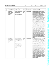 Drucksache 18/ 12772 18/12772 – 10 – – – 10 Deutscher DeutscherBundestag Bundestag––18. 18.Wahlperiode Wahlperiode Vorabfassung - wird durch die lektorierte Version ersetzt. Lfd. Fördergebiet Träger / Titel Jahr Bundesmittel Kurzbeschreibung Nr. 2 Wilhelms- Träger: Sport ohne 201 4.500,00 € Mit dem Aufbau eines Kampf- burg, Bezirk Grenzen e.V. 6 sportangebotes bei "Sport ohne Hamburg- Grenzen e.V." sollen junge Mitte Titel: Kick4Peace Menschen aus Wilhelmsburg aus verschiedenen Kontexten einen Raum für Alltagsaus- gleich und Stressabbau bekom- men. Zu den wesentlichen As- pekten von Kampfkünsten ge- hören soziale Kompetenzen wie Haltung, Selbstdisziplin, Be- scheidenheit bis hin zu Medita- tion. Das Erlernen eines res- pektvollen Umgangs mit mittrai- nierenden Mitmenschen, Team- geist und die Sensibilisierung für das Thema Gewalt stehen dabei im Zentrum. Die körperli- che Betätigung der Trainieren- den führt zu mehr Körpergefühl und Selbstvertrauen. Daraus lässt sich neue Motivation zu neuen individuellen und persön- lichen Zielsetzungen, sowohl sportlich, als auch privat entwi- ckeln. 3 Landkreis Träger: Kampf- 201 1.380,00 € Durch Inklusion sollen Jugendli- Schmalkal- sportzentrum Uni- 7 che und Männer in Sportgrup- den-Meinin- versum Meiningen pen eingebunden werden. Sie gen e.V. sollen lernen ihre Aggressionen besser zu kontrollieren. Entste- Titel: Integration hende Konflikte werden auch und Engagement sozialpädagogisch betreut. Ein in der Abteilung Ziel ist es die Teilnehmer in Boxen Vereinsarbeit zu integrieren. Den einheimischen Bürgern soll die Begegnung mit Flüchtlingen ermöglicht werden. Es dient dazu Hemmungen abzubauen und auch gegenseitig von ei- nander zu lernen. Denn die Teilnehmenden sollen gemein- same Freizeitaktivitäten planen, um ein Gruppengefühl entste- hen zu lassen.