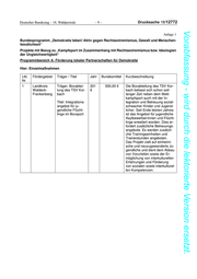 Deutscher Bundestag Deutscher Bundestag –– 18. 18. Wahlperiode Wahlperiode – 9– –9 – Drucksache Drucksache18 18/ 12772 /12772 Vorabfassung - wird durch die lektorierte Version ersetzt. Anlage 1 Bundesprogramm „Demokratie leben! Aktiv gegen Rechtsextremismus, Gewalt und Menschen- feindlichkeit“ Projekte mit Bezug zu „Kampfsport im Zusammenhang mit Rechtsextremismus bzw. Ideologien der Ungleichwertigkeit“ Programmbereich A: Förderung lokaler Partnerschaften für Demokratie Hier: Einzelmaßnahmen Lfd. Fördergebiet Träger / Titel Jahr Bundesmittel Kurzbeschreibung Nr. 1 Landkreis Träger: Boxabtei- 201 500,00 € Die Boxabteilung des TSV Kor- Waldeck- lung des TSV Kor- 6 bach befasst sich schon seit Frankenberg bach langer Zeit neben dem Wett- kampfsport auch mit der In- Titel: Integrations- tegration und Betreuung sozial- angebot für ju- schwacher Kinder und Jugend- gendliche Flücht- licher. Seit Ende letzten Jahres linge im Boxsport ist das Angebot für jugendliche Asylbewerber/innen und Flücht- linge erweitert worden. Dies er- fordert zusätzliche Betreuungs- angebote. Es werden zusätzli- che Trainingseinheiten und Trainerstunden angeboten. Das Projekt zielt auf einheimi- sche und neuzugewanderte Ju- gendliche und dient dem Abbau von Vorurteilen sowie der Er- möglichung von interkulturellen Erfahrungen und Förderung von sozialen sowie interkulturel- len Kompetenzen.