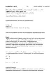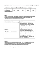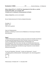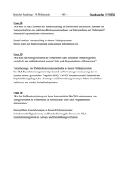 Drucksache 19/16934 ‒ 682 ‒ Deutscher Bundestag – 19. Wahlperiode - Arbeitsvolumen der Verwaltung in Stunden während der Laufzeit des Programms Auftrag/Jahr 2015 2016 2017 2018 2019 Nat. Copernicus 1100 1200 2200 2250 2700 Integrationsmaßnahme Frage 5 „Welche Methoden werden zur Evaluation der einzelnen Förderprogramme verwendet? Bitte nach der jeweiligen Programmlinie, dem Zeitpunkt der letzten Evaluierung und den Zeitabständen zwischen den Evaluierungen aufschlüsseln.“ Zeitpunkt der Evaluierung Methode Auf Ebene der Einzelvorhaben: regelmäßig Anhand von Zwischenberichten der Zuwendungsempfänger wird jährlich der Erfolg des jeweiligen Vorhabens überprüft. Am Ende des Vorhabens wird ein Schlussbericht geprüft, der einen expliziten „Eine Evaluation erfolgt zum Abschluss des Erfolgskontrollbericht (nicht veröffentlicht) Programms.“ beinhaltet, in dem auch evaluiert wird inwieweit die Maßnahme erfolgreich war. Auf der Ebene des Förderprogramms: Erhebung und Auswertung der Anzahl von Jährlich Anträgen und geförderten Vorhaben, der Verteilung nach Branchen, Verwaltungsebenen und weiteren Merkmalen. Summarische Auswertung der Erreichung der Förderziele Frage 11 „Hat die Bundesregierung Kenntnis darüber, ob und wenn ja welche Faktoren (Bürokratie, geringe Förderwahrscheinlichkeit o.ä.) abschreckend auf die Antragstellenden auf Fördermittel wirken könnten? Bitte nach Programmlinien differenzieren.“ Hierzu liegen der Bundesregierung keine eigenen Erkenntnisse vor.