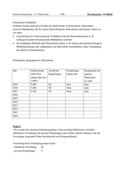Deutscher Bundestag – 19. Wahlperiode ‒ 689 ‒ Drucksache 19/16934 Fördergebiet (inhaltlich): Gefördert werden innovative Projekte des Radverkehrs in Deutschland, insbesondere investive Maßnahmen, die die weitere Entwicklung des Radverkehrs unterstützen, indem sie vor allem • einen Beitrag zur Verbesserung der Verhältnisse für den Radverkehr leisten (z. B. richtungsweisende infrastrukturelle Maßnahmen) und/oder • die nachhaltige Mobilität durch Radverkehr sichern (z. B. urbane oder quartiers-bezogene Mobilitätskonzepte und -maßnahmen zum Radverkehr einschließlich seiner Verknüpfung mit anderen Verkehrsmitteln). Fördergebiet (geographisch): Deutschland Jahr Fördersumme Anzahl der Projektträger Kooperation mit (Soll 2019, Begünstigten Name/ nein anderen übrige Jahre Ist) Ministerien 1 000 € ja / nein 2019 5.000 66 nein nein 2018 5.000 58 Nein nein 2017 4.190 58 Nein nein 2016 2015 2014 2013 2012 2011 2010 Frage 2 „Wie werden die einzelnen Förderprogramme in den jeweiligen Ministerien verwaltet (öffentliche Verwaltung oder privater Projektträger) und welches Arbeitsvolumen ist für die Verwaltung vorgesehen? Bitte aufschlüsseln nach Programmlinien.“ Verwaltung dieses Förderprogrammes durch - öffentliche Verwaltung ☒ - privaten Projektträger ☐