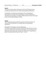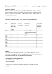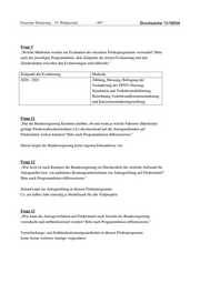 Deutscher Bundestag – 19. Wahlperiode ‒ 697 ‒ Drucksache 19/16934 Frage 5 „Welche Methoden werden zur Evaluation der einzelnen Förderprogramme verwendet? Bitte nach der jeweiligen Programmlinie, dem Zeitpunkt der letzten Evaluierung und den Zeitabständen zwischen den Evaluierungen aufschlüsseln.“ Zeitpunkt der Evaluierung Methode 2020 – 2021 Zählung, Messung, Befragung der Veränderung der ÖPNV-Nutzung, Simulation und Verkehrsmodellierung, Berechnung Verkehrsaufkommensänderung und Emissionsminderungswirkung Frage 11 „Hat die Bundesregierung Kenntnis darüber, ob und wenn ja welche Faktoren (Bürokratie, geringe Förderwahrscheinlichkeit o.ä.) abschreckend auf die Antragstellenden auf Fördermittel wirken könnten? Bitte nach Programmlinien differenzieren.“ Hierzu liegen der Bundesregierung keine eigenen Erkenntnisse vor. Frage 12 „Wie hoch ist nach Kenntnis der Bundesregierung im Durchschnitt der zeitliche Aufwand für Antragsteller bzw. ein auditiertes Beratungsunternehmen zur Antragstellung auf Fördermittel? Bitte nach Programmlinien differenzieren.“ Zeitaufwand zur Antragstellung in diesem Förderprogramm: Ca. ein halbes Jahr einmalig je Modellstadt für alle Teilprojekte Frage 13 „Wie kann das Antragsverfahren auf Fördermittel nach Ansicht der Bundesregierung vereinfacht und entbürokratisiert werden? Bitte nach Programmlinien differenzieren.“ Vereinfachungs- und Entbürokratisierungsmethoden in diesem Förderprogramm: keine (keine weiteren Anträge vorgesehen)