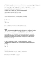 Drucksache 19/16934 ‒ 692 ‒ Deutscher Bundestag – 19. Wahlperiode Kleine Anfrage BT-Drs. Nr. 19/13973 der Abgeordneten Dr. Petra Sitte, u.a. und der Fraktion DIE LINKE. vom 14. Oktober 2019 Evaluation und Verwaltung der Förderprogramme des Bundes Anlage zu Fragen Nrn. 1, 2, 5, 11, 12, 13 und 14 Ressort: Bundesministerium für Verkehr und digitale Infrastruktur Einzelplan: 12 Kapitel: 10 Titel: 633 02 Name des Förderprogramms: Förderrichtlinie Städtische Logistik Frage 1 „Welche Förderprogramme des Bundes existieren und welche davon betreffen nach Kenntnis der Bundesregierung hauptsächlich die Felder Wirtschaft, Soziales und Arbeitsmarkt, Umwelt, Gesundheitspolitik und Medizintechnik, Sicherheitspolitik sowie Entwicklungspolitik? Bitte für die letzten zehn Jahre nach federführendem Ministerium, Fördergebiet, Förderzeitraum, Entwicklung der Fördersummen, Anzahl der Begünstigten, Haushaltstitel und Projektträger aufschlüsseln und ggf. Kooperation zwischen mehreren Ministerien kennzeichnen.“ Ist eines der Förderfelder („Wirtschaft“, „Soziales und Arbeitsmarkt“, „Umwelt“, „Gesundheitspolitik und Medizintechnik“, Sicherheitspolitik“ oder „Entwicklungspolitik“) betroffen? Ja: ☒ Nein: ☐ Förderzeitraum: Aktueller Förderzeitraum: 5. Juli 2019 bis zum 31. Dezember 2021 Fördergebiet (inhaltlich): Städtische Logistik