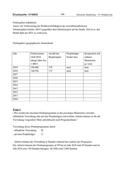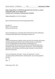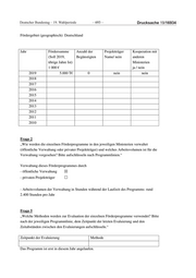 Deutscher Bundestag – 19. Wahlperiode ‒ 693 ‒ Drucksache 19/16934 Fördergebiet (geographisch): Deutschland Jahr Fördersumme Anzahl der Projektträger Kooperation mit (Soll 2019, Begünstigten Name/ nein anderen übrige Jahre Ist) Ministerien 1 000 € ja / nein 2019 5.000 T€ 0 nein nein 2018 2017 2016 2015 2014 2013 2012 2011 2010 Frage 2 „Wie werden die einzelnen Förderprogramme in den jeweiligen Ministerien verwaltet (öffentliche Verwaltung oder privater Projektträger) und welches Arbeitsvolumen ist für die Verwaltung vorgesehen? Bitte aufschlüsseln nach Programmlinien.“ Verwaltung dieses Förderprogrammes durch - öffentliche Verwaltung ☒ - privaten Projektträger ☐ - Arbeitsvolumen der Verwaltung in Stunden während der Laufzeit des Programms: rund 2.400 Stunden pro Jahr Frage 5 „Welche Methoden werden zur Evaluation der einzelnen Förderprogramme verwendet? Bitte nach der jeweiligen Programmlinie, dem Zeitpunkt der letzten Evaluierung und den Zeitabständen zwischen den Evaluierungen aufschlüsseln.“ Zeitpunkt der Evaluierung Methode Das Programm ist erst in diesem Jahr angelaufen.
