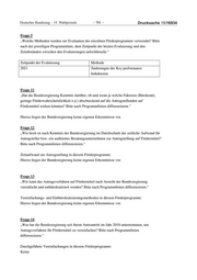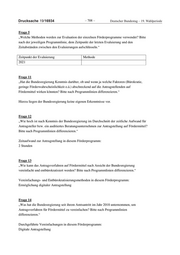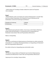 Drucksache 19/16934 ‒ 704 ‒ Deutscher Bundestag – 19. Wahlperiode - Arbeitsvolumen der Verwaltung in Stunden während der Laufzeit des Programms 2 Std. wöchentlich Frage 5 „Welche Methoden werden zur Evaluation der einzelnen Förderprogramme verwendet? Bitte nach der jeweiligen Programmlinie, dem Zeitpunkt der letzten Evaluierung und den Zeitabständen zwischen den Evaluierungen aufschlüsseln.“ Zeitpunkt der Evaluierung Methode In Bearbeitung Extern Frage 11 „Hat die Bundesregierung Kenntnis darüber, ob und wenn ja welche Faktoren (Bürokratie, geringe Förderwahrscheinlichkeit o.ä.) abschreckend auf die Antragstellenden auf Fördermittel wirken könnten? Bitte nach Programmlinien differenzieren.“ Hürde zur Antragstellung. Frage 12 „Wie hoch ist nach Kenntnis der Bundesregierung im Durchschnitt der zeitliche Aufwand für Antragsteller bzw. ein auditiertes Beratungsunternehmen zur Antragstellung auf Fördermittel? Bitte nach Programmlinien differenzieren.“ Der zeitliche Aufwand zur Antragstellung kann nicht beziffert werden. Frage 13 „Wie kann das Antragsverfahren auf Fördermittel nach Ansicht der Bundesregierung vereinfacht und entbürokratisiert werden? Bitte nach Programmlinien differenzieren.“ Anpassung auf ein zweistufiges Antragsverfahren.