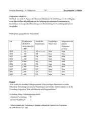 Deutscher Bundestag – 19. Wahlperiode ‒ 707 ‒ Drucksache 19/16934 Fördergebiet (inhaltlich): Der Bund setzt sich im Rahmen des Maritimen Bündnisses für Ausbildung und Beschäftigung in der Seeschifffahrt für den Erhalt und die Sicherung der maritimen Fachkenntnisse in Deutschland ein und gewährt Zuwendungen zur Bereitstellung von Ausbildungsplätzen auf Seeschiffen. Fördergebiet (geographisch): Deutschland Jahr Fördersumme Anzahl der Projektträger Kooperation mit (Soll 2019, Begünstigten Name/ nein anderen übrige Jahre Ist) Ministerien 1 000 € ja / nein 2019 1.350 65 (St. 13.11.19) Nein Nein 2018 3.500 189 Nein Nein 2017 4.600 218 Nein Nein 2016 4.100 232 Nein Nein 2015 6.900 193 Nein Nein 2014 2.200 356 Nein Nein 2013 4.200 179 Nein Nein 2012 4.800 207 Nein Nein 2011 4.600 224 Nein Nein 2010 5.600 250 Nein Nein Frage 2 „Wie werden die einzelnen Förderprogramme in den jeweiligen Ministerien verwaltet (öffentliche Verwaltung oder privater Projektträger) und welches Arbeitsvolumen ist für die Verwaltung vorgesehen? Bitte aufschlüsseln nach Programmlinien.“ Verwaltung dieses Förderprogrammes durch - öffentliche Verwaltung ☒ - privaten Projektträger ☐ - Arbeitsvolumen der Verwaltung in Stunden während der Laufzeit des Programms rd. 4.000 Stunden pro Jahr