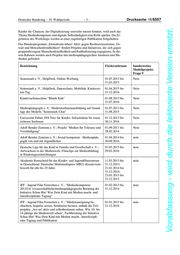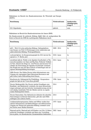 Drucksache 18/6557 –8– Deutscher Bundestag – 18. Wahlperiode Vorabfassung - wird durch die lektorierte Version ersetzt. Maßnahmen im Bereich des Bundesministeriums für Wirtschaft und Energie (BMWi) Bezeichnung Förderzeitraum bundesweites Modellprojekt; Frage 9 D21 Digitalindex jährlich nein Maßnahmen im Bereich des Bundesministeriums des Innern (BMI) Die Bundeszentrale für politische Bildung (BpB) führt als nachgeordnete Be- hörde im Bereich des BMI die nachfolgenden Maßnahmen durch. Bezeichnung Förderzeitraum bundesweites Modellprojekt; Frage 9 pb21 - Web 2.0 in der politischen Bildung: Onlineplattform 2009 - 2014 Ja zum Einsatz von Web 2.0 Werkzeugen in der schulischen und außerschulischen Bildung; Weiterqualifikation werkstatt.bpb.de; Als Kooperationsprojekt bis 2014 mit der Ko- 2010 - heute Ja operative e. V. Berlin, jetzt netzdebatte.bpb.de: Politik in der digitalen Gesellschaft, in The- 2014 - heute Ja menschwerpunkten wie Open und Big Data, Politische Teilhabe im Netz, Internet der Dinge etc. wird Wissen zum besseren Ver- ständnis der Entwicklung der digitalen Gesellschaft vermitteln. Das Projekt hat zum Ziel diese kritisch zu hinterfragen und zur eigenen Meinungsbildung beizutragen. OER-Dossier; Das Online-Dossier liefert Informationen zum 2014 Ja Umgang mit sogenannten Open Educational Ressources und gibt Lehrer/-innen Hilfestellung beim Einsatz. Kinofenster.de; Onlineportal für Filmbildung - Kooperations- 1996 - heute Ja projekt der bpb mit der Vision Kino gGmbH Dossier Medienpolitik; Das Dossier möchte Grundlagen zum 2014 Ja Rundfunk- und Medienrecht vermitteln, die neuen Herausforde- rungen aufzeigen und eine kritische Auseinandersetzung mit der sich ständig wandelnden Welt der Medien und der sie regulie- renden Medienpolitik fördern. Dossier Datenschutz; Das Onlinedossier diskutiert die aktuellen 2014 Ja Entwicklungen im Bereich Datenschutz, gibt aber auch Hilfe- stellungen zum sicheren Surfen. Lokaljournalistenprogramm; Online und Offline werden Jour- 1975 - heute ja nalisten Informationen und Hilfestellungen zum differenzierten Umgang mit Themen der politischen Bildung vermittelt sowie der Einsatz neuer Medien diskutiert. HanisauLand.de; HanisauLand will Kindern von 8 bis 14 Jahren 2002 - heute ja politische Grundlagen vermitteln und ihnen eine Vorstellung davon geben, wie demokratisches Zusammenleben funktioniert.