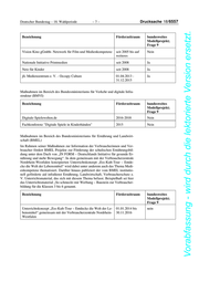 Deutscher Bundestag – 18. Wahlperiode –7– Drucksache 18/6557 Vorabfassung - wird durch die lektorierte Version ersetzt. Bezeichnung Förderzeitraum bundesweites Modellprojekt; Frage 9 Vision Kino gGmbh- Netzwerk für Film und Medienkompetenz seit 2005 bis auf Nein weiteres Nationale Initiative Printmedien seit 2008 Ja Netz für Kinder seit 2008 Ja jfc Medienzentrum e. V. - Occupy Culture 01.04.2013 - Ja 31.12.2015 Maßnahmen im Bereich des Bundesministeriums für Verkehr und digitale Infra- struktur (BMVI) Bezeichnung Förderzeitraum bundesweites Modellprojekt; Frage 9 Digitale-Spielewelten.de 2016-2018 Nein Fachkonferenz "Digitale Spiele in Kinderhänden" 2015 Nein Maßnahmen im Bereich des Bundesministeriums für Ernährung und Landwirt- schaft (BMEL) Im Rahmen seiner Maßnahmen zur Information der Verbraucherinnen und Ver- braucher fördert BMEL Projekte zur Förderung der schulischen Ernährungsbil- dung unter dem Dach von „IN FORM – Deutschlands Initiative für gesunde Er- nährung und mehr Bewegung“. In dem gemeinsam mit der Verbraucherzentrale Nordrhein-Westfalen konzipierten Unterrichtskonzept „Ess-Kult-Tour – Entde- cke die Welt der Lebensmittel“ wird dabei unter anderem auch das Thema Medi- enkompetenz thematisiert. Darüber hinaus publiziert der vom BMEL institutio- nell geförderte aid infodienst Ernährung, Landwirtschaft, Verbraucherschutz e. V. Unterrichtsmaterial, das sich mit diesem Thema befasst. Beispielhaft sei hier das Unterrichtsmaterial „So schmeckt mir Werbung – Baustein zur Verbraucher- bildung für die Klassen 3 bis 6 genannt. Bezeichnung Förderzeitraum bundesweites Modellprojekt; Frage 9 Unterrichtskonzept „Ess-Kult-Tour – Entdecke die Welt der Le- 01.01.2014 bis nein bensmittel“ gemeinsam mit der Verbraucherzentrale Nordrhein- 30.11.2016 Westfalen