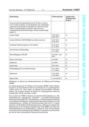 Deutscher Bundestag – 18. Wahlperiode –9– Drucksache 18/6557 Vorabfassung - wird durch die lektorierte Version ersetzt. Bezeichnung Förderzeitraum bundesweites Modellprojekt; Frage 9 In der gesamten Kommunikation auf der Website (vormode- riert) werden die Kinder von der Redaktion unter medienpäda- gogischen Gesichtspunkten aufgeklärt. Ein „Spezial“ hat das Thema „Sicherheitstipps im Internet“ https://www.ha- nisauland.de/spezial/sicherheitstipps-internet/sicherheitstipps- kapitel-1/ einfach Online 10.07.2014 - Ja 28.02.2015 einfach SOZIALE NETZWERKE (youTube, facebook) 10.07.2014 - Ja 28.02.2015 Datenbank Medienkompetenz: Neue Medien 01.01.2014 - Ja 31.12.2015 Orientierung im Medienalltag 01.01.2014- Ja 31.12.2015 Eltern/Pädagogen ONLINE Juni 2014 - Dez. Ja 2015 Eltern-LAN Games seit 2009 Ja spielbar.de seit 2007 Ja gamescamp 2014-2016 Ja Medienpädagogik in der Heimerziehung 01.01.2015 - Ja 31.12.2016 Spieletester 15.03.2015 - Ja 31.03.2016 Spielewelten seit 05.08.2013 Ja Maßnahmen im Bereich des Bundesministeriums für Bildung und Forschung (BMBF) Das Bundesministerium für Bildung und Forschung (BMBF) fördert Medien- kompetenz als Querschnittsziel nicht erst mit Beginn der 18. Legislaturperiode, sondern bereits seit vielen Jahren im Rahmen unterschiedlicher Förderpro- gramme. Die einzelnen Projekte mit Beginn 18. Legislaturperiode können der nachfolgenden Tabelle entnommen werden. Ferner initiiert das BMBF im Rahmen der aktuellen Fördermaßnahme zur „Me- dienqualifizierung pädagogischer Fachkräfte“ (www.bmbf.de/foerderungen/ bekanntmachung.php?B=1031) Modellprojekte zur Medienkompetenzförderung von beruflichen Ausbildenden. Entsprechende Förderanträge befinden sich in der Antragstellung bzw. -prüfung. Zur Weiterentwicklung seiner in der 17. Legisla- turperiode veröffentlichten Förderbekanntmachung „Stärkung der digitalen Me- dienkompetenz in der beruflichen Qualifizierung“ plant BMBF eine Folge-För- derbekanntmachung (sog. Medienbildung 2, geplant für 2016) mit Schwerpunkt auf den Bereich der berufsbegleitenden Bildung in Unternehmen und Einrichtun- gen und der damit einhergehenden Organisationsentwicklung.