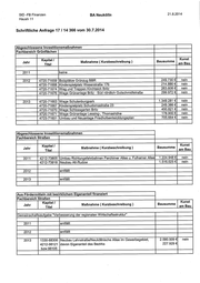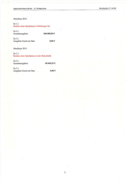 AbgeordnetenhausBERLIN 17. Wahlperiode Schriftliche Anfrage Anlage 8 Drucksache 17/ 14 366 Schriftliche Anfrage des Abgeordneten Oliver Schruoffeneger (GRÜNE) vom 30.Juli 2014 (Eingang beim Abgeordnetenhaus am 13. August 2014) und Antwort Abgeschlossene Investitionsmaßnahmen Ich frage den Senat: lz Welche Investitionsmaßnahmen (Hochbau, Landschaftsbau oder Straßenbau) wurden in den einzel- nen Senatsverwaltungen und in den Bezirken in den Jah- ren 2011 bis 2013 jeweils baulich abgeschlossen? 2; Wie hoch waren jeweils die aktuell bekannten Gesamtausgaben (falls bekannt Schlussabrechnung, sonst letzte Kostenschätzung BPU)? 3; Welche Ausgaben wurden jeweils für Maß- nahmen Kunst am Bau getätigt? Antwort Im Namen des Senats von Berlin beantworte ich Ihre Schriftliche Anfrage wie folgt: Bezirksamt Pankow von Berlin Hochbaumaßnahmen Zul.) Neubau einer Sporthalle und Sportaußenanlage Straße 18 Nr. 37, 13156 Berlin. (Neubau einer Sporthalle in Pan- kow, Charlottenstr.) Zu 2.) Gesamtausgaben: 4.641.671,20 EURO Zu 3.) Ausgaben Kunst am Bau: 23.800,- EURO Straßenbauinvestitionsmaßnahmen Abschluss jeweils 2013 Zu 1.) Umbau der Berliner Str. von Granitzstraße bis Breite Straße Zu 2.) Gesamtausgaben: 3.084.013,98 € Zu 3.) Ausgaben Kunst am Bau: 13.954,46 € Zul.) Neubau der Pasewalker Straße von Autobahnauffahrt A 114 bis Eweststraße Zu 2.) Gesamtausgaben: 4.386.973,90 € Zu 3.) Ausgaben Kunst am Bau: 30.823,60 € Landschaftsbau Abschluss 2011 Zu 1.) Neubau eines Kinderspielplatzes in der Lehderstraße Zu 2.) Gesamtausgaben: 100.000,00 € Zu 3.) Ausgaben Kunst am Bau: 0,00 € Die Drucksachen des Abgeordnetenhauses sind bei der Kulturbuch-Verlag GmbH zu beziehen. Hausanschrift: Sprosserweg 3, 12351 Berlin-Buckow.: Postanschrift: Postfach 47 04 49, 12313 Berlin, Telefon: 6 61 84 84; Telefax: 6 61 78 28.