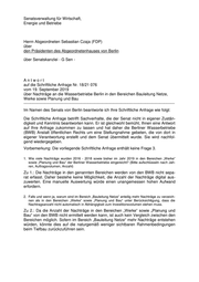 Senatsverwaltung für Wirtschaft, Energie und Betriebe Herrn Abgeordneten Sebastian Czaja (FDP) über den Präsidenten des Abgeordnetenhauses von Berlin über Senatskanzlei - G Sen - Antwort auf die Schriftliche Anfrage Nr. 18/21 076 vom 19. September 2019 über Nachträge an die Wasserbetriebe Berlin in den Bereichen Bauleitung Netze, Werke sowie Planung und Bau ----------------------------------------------------------------------------------------------------------------- Im Namen des Senats von Berlin beantworte ich Ihre Schriftliche Anfrage wie folgt: Die Schriftliche Anfrage betrifft Sachverhalte, die der Senat nicht in eigener Zustän- digkeit und Kenntnis beantworten kann. Er ist gleichwohl bemüht, Ihnen eine Antwort auf Ihre Anfrage zukommen zu lassen und hat daher die Berliner Wasserbetriebe (BWB) Anstalt öffentlichen Rechts um eine Stellungnahme gebeten, die von dort in eigener Verantwortung erstellt und dem Senat übermittelt wurde. Sie wird nachfol- gend wiedergegeben. Vorbemerkung: Die vorliegende Schriftliche Anfrage enthält keine Frage 3. 1. Wie viele Nachträge wurden 2016 - 2018 sowie bisher im Jahr 2019 in den Bereichen „Werke“ sowie „Planung und Bau“ der Berliner Wasserbetriebe eingereicht? (Bitte aufschlüsseln nach Jah- ren, Auftragsvolumen, Anzahl) Zu 1.: Die Nachträge in den genannten Bereichen werden von den BWB nicht sepa- rat erfasst. Daher bestehe keine Möglichkeit, die Anzahl der Nachträge digital aus- zuwerten. Eine manuelle Auswertung würde einen unangemessen hohen Aufwand erfordern. 2. Falls und wenn ja, warum sind im Bereich „Bauleitung Netze“ anteilig mehr Nachträge zu verzeich- nen als in den Bereichen „Werke“ sowie „Planung und Bau“ unter Berücksichtigung, dass die Nachtragsanzahl nicht automatisch in Abhängigkeit zum Investitionsvolumen stehen muss. Zu 2.: Da die Anzahl der Nachträge in den Bereichen „Werke“ sowie „Planung und Bau“ von den BWB nicht ermittelt werden kann, ist auch kein Vergleich zwischen den Bereichen möglich. Sofern im Bereich „Bauleitung Netze“ mehr Nachträge entstehen würden, könnte dies auf die naturgemäß weniger sichtbaren Rahmenbedingungen beim Tiefbau zurückzuführen sein.