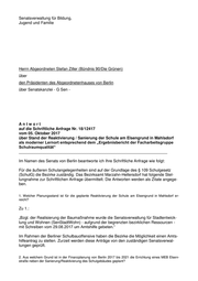 Drucksache 18 / 12 417 Schriftliche Anfrage 18. Wahlperiode Schriftliche Anfrage des Abgeordneten Stefan Ziller (GRÜNE) vom 05. Oktober 2017 (Eingang beim Abgeordnetenhaus am 09. Oktober 2017) zum Thema: Stand der Reaktivierung / Sanierung der Schule am Elsengrund in Mahlsdorf als moderner Lernort entsprechend dem „Ergebnisbericht der Facharbeitsgruppe Schulraumqualität“ und Antwort vom 24. Oktober 2017 (Eingang beim Abgeordnetenhaus am 27. Okt. 2017) Die Drucksachen des Abgeordnetenhauses sind bei der Kulturbuch-Verlag GmbH zu beziehen. Hausanschrift: Sprosserweg 3, 12351 Berlin-Buckow · Postanschrift: Postfach 47 04 49, 12313 Berlin, Telefon: 6 61 84 84; Telefax: 6 61 78 28.