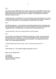 -2- Zu 2.: „Die Errichtung einer MEB (Modularer Ergänzungsbau) durch SenStadtWohn bedarf eines bedeutend kürzeren Zeitraumes als die unter 1. genannte Baumaßnahme. Insofern kann damit zunächst relativ kurzfristig auf das in der Region zu konstatierende Grundschul- platzdefizit reagiert werden.“ 3. Welche Alternativen zu ein MEB lassen sich in den kommenden Jahren finden/entwickeln, um am Stand- ort Elsenstraße einen modernen Lernort zu entwickeln, der Gesichtspunkte einer modernen Pädagogik ent- sprechend dem „Ergebnisbericht der Facharbeitsgruppe Schulraumqualität“ berücksichtigt? Zu 3.: „Die Berücksichtigung u. a. der Intentionen des Ergebnisberichtes der Facharbeitsgruppe Schulraumqualität wird Gegenstand der konkreten inhaltlichen Planungen hinsichtlich der Ausgestaltung bzw. Ausstattung des zu reaktivierenden Schulstandortes sein.“ 4. Welche Sanierungs-, Umbau- bzw. Neubaumaßnahmen sind bisher geplant? Zu 4.: „Die konkrete Art und Weise der erforderlichen Sanierungs-, Umbau- bzw. Neubaumaß- nahmen sowie deren Umsetzung – auch unter Berücksichtigung der Intentionen des Er- gebnisberichtes der Facharbeitsgruppe Schulraumqualität – wird Gegenstand des Pla- nungs- und Umsetzungsprozesses sein.“ 5. Welcher Zeitplan liegt für diese Sanierungs-, Umbau- und Neubauplanungen bisher vor? Zu 5.: „Siehe Antwort zu 1. Ein konkreter Zeitplan liegt bisher nicht vor.“ Berlin, den 24. Oktober 2017 In Vertretung Mark Rackles Senatsverwaltung für Bildung, Jugend und Familie