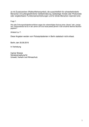 ze mit Zusatzzeichen (Rollstuhlfahrersymbol), die ausschließlich für schwerbehinderte Menschen mit außergewöhnlicher Gehbehinderung, beidseitiger Amelie oder Phokomelie oder vergleichbaren Funktionseinschränkungen und für blinde Menschen reserviert sind. Frage 7: Wie viele Ordnungswidrigkeitenverfahren wegen der unberechtigten Nutzung eines „blauen“ oder „orange- nen“ Parkausweises hat es in den Jahren 2015 bis heute jeweils jährlich in den einzelnen Berliner Bezirken gegeben? Antwort zu 7: Diese Angaben werden vom Polizeipräsidenten in Berlin statistisch nicht erfasst. Berlin, den 20.09.2019 In Vertretung Ingmar Streese Senatsverwaltung für Umwelt, Verkehr und Klimaschutz 5