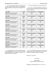 Drucksache 18 / 10 898 Schriftliche Anfrage 18. Wahlperiode Schriftliche Anfrage des Abgeordneten Marcel Luthe (FDP) vom 27. März 2017 (Eingang beim Abgeordnetenhaus am 06. April 2017) und Antwort Leistung der Berliner Feuerwehr Im Namen des Senats von Berlin beantworte ich Ihre Zu 1.: Aufgrund der vorhandenen Auswertungsmög- Schriftliche Anfrage wie folgt: lichkeiten sind belastbare Angaben zu Überstunden bei der Berliner Feuerwehr erst ab 2011 möglich. Der Ge- 1. Wie viele Überstunden sind in den Jahren 1996 bis samtstand der Überstunden betrug am 31.12.2011: 2016 jeweils zum Stichtag 31.12. bei der Berliner Feuer- 267.694 Stunden und am 31.12.2012: 318.195 Stunden. wehr - separat nach den Direktionen, Stab und Ser- In der erfragten Detaillierung sind Angaben erst ab 2013 viceeinheiten - geleistet worden? möglich: Bereich 2013 2014 2015 2016 Direktion Nord 83.479 84.336 95.866 91.235 Direktion Süd 71.085 90.033 135.227 129.317 Direktion West 111.966 113.899 128.769 161.467 Stab Landesbranddirektor 12.677 16.816 18.848 26.162 Serviceeinheiten mit Rettungs- 77.716 84.487 113.418 167.121 dienst Akademie gesamt 356.923 389.571 492.128 575.302 2. Wann und wie wurden bzw. werden diese jeweils Angaben über die Kosten der Mehrarbeitsvergütung auf die einzelnen Jahren bezogen abgebaut oder vergütet? liegen nur für die Jahre 2011 bis 2016 vor und sind der Welche Gesamtkosten entstehen dadurch? folgenden Tabelle zu entnehmen. Vorsorglich wird darauf hingewiesen, dass die Dienstkräfte aufgrund der maßgeb- Zu 2.: Seit 2011 bis 2016 sind folgende Stunden zur lichen Verjährungsfristen drei Jahre Zeit haben, um einen Auszahlung gebracht worden. Die Angaben beziehen sich finanziellen Ausgleich in Anspruch zu nehmen und daher auf das Jahr, in dem die Stunden geleistet worden sind: die ausgezahlte Vergütung des jeweiligen Jahres in der Regel auch Überstundenbestandteile noch nicht verjährter Jahr Gesamt (Stunden) Zeiträume enthält. Eine unmittelbare Korrelation zu den 2011 84.159 Angaben in der vorstehenden Tabelle besteht somit nicht. 2012 112.806 2013 144.086 Jahr Vergütung von Mehrarbeit bei 2014 94.821 der Feuerwehr in € 2015 97.542 2011 1.051.089 2016 72.710 2012 1.138.114 2013 2.305.141 2014 1.963.141 2015 1.599.701 2016 1.893.876 Die Drucksachen des Abgeordnetenhauses sind bei der Kulturbuch-Verlag GmbH zu beziehen. Hausanschrift: Sprosserweg 3, 12351 Berlin-Buckow · Postanschrift: Postfach 47 04 49, 12313 Berlin, Telefon: 6 61 84 84; Telefax: 6 61 78 28.