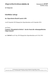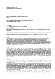 Drucksache 18 / 20 947 Schriftliche Anfrage 18. Wahlperiode Schriftliche Anfrage des Abgeordneten Harald Laatsch (AfD) vom 09. September 2019 (Eingang beim Abgeordnetenhaus am 09. September 2019) zum Thema: Geplanter Mietendeckel in Berlin I – hat der Senat alle wohnungspolitischen Folgen bedacht? und Antwort vom 26. Sep. 2019 (Eingang beim Abgeordnetenhaus am 01. Okt. 2019) Die Drucksachen des Abgeordnetenhauses sind bei der Kulturbuch-Verlag GmbH zu beziehen. Hausanschrift: Sprosserweg 3, 12351 Berlin-Buckow · Postanschrift: Postfach 47 04 49, 12313 Berlin, Telefon: 6 61 84 84; Telefax: 6 61 78 28.