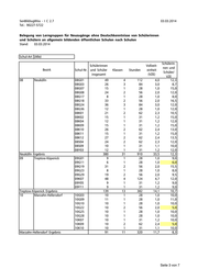 SenBildJugWiss - I C 2.7 03.03.2014 Tel.: 90227-5722 Belegung von Lerngruppen für Neuzugänge ohne Deutschkenntnisse von Schülerinnen und Schülern an allgemein bildenden öffentlichen Schulen nach Schulen Stand: 03.03.2014 Schul-Art (Alle) Schülerin- Schülerinnen Vollzeit- nen und Bezirk Schul-Nr. und Schüler Klassen Stunden einheit Schüler/ insgesamt (VZE) VZE 05 Spandau 05G03 24 2 56 2,0 12,0 05G06 12 1 28 1,0 12,0 05G11 35 3 84 3,0 11,7 05G13 18 1 28 1,0 18,0 05G19 17 2 56 2,0 8,5 05G24 21 2 56 2,0 10,5 05K01 12 1 31 1,2 12,0 05K03 9 1 31 1,2 9,0 05K04 11 1 31 1,2 11,0 05K05 35 3 93 3,6 11,7 05K07 10 1 31 1,2 10,0 05K08 11 1 31 1,2 11,0 05K09 10 1 31 1,2 10,0 05Y04 24 2 62 2,4 12,0 Spandau Ergebnis 249 22 649 24,1 11,3 06 Steglitz-Zehlendorf 06G08 8 1 28 1,0 8,0 06G31 13 1 28 1,0 13,0 06K10 100 9 279 10,7 11,1 Steglitz-Zehlendorf Ergebnis 121 11 335 12,7 11,0 07 Tempelhof-Schöneberg 07G01 20 2 56 2,0 10,0 07G12 12 1 28 1,0 12,0 07G18 12 1 28 1,0 12,0 07G26 23 2 56 2,0 11,5 07G27 36 3 84 3,0 12,0 07G28 20 3 84 3,0 6,7 07G32 36 3 84 3,0 12,0 07G34 21 3 84 3,0 7,0 07G35 12 1 28 1,0 12,0 07K03 24 2 62 2,4 12,0 07K07 37 3 93 3,6 12,3 07K11 11 1 31 1,2 11,0 07K12 23 2 62 2,3 11,5 07Y03 23 2 62 2,4 11,5 07Y06 24 2 62 2,4 12,0 07Y08 12 1 31 1,2 12,0 07Y09 12 1 31 1,2 12,0 Tempelhof-Schöneberg Ergebnis 358 33 966 35,6 10,8 Seite 2 von 7
