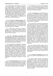Abgeordnetenhaus Berlin – 17. Wahlperiode Drucksache 17 / 13 419 Die Anzahl der Kinder mit rumänischer oder bulgari- Zu 7.: Bezüglich der Anzahl der Praxislerngruppen scher Staatsangehörigkeit, die in Berlin eine Schule be- verweise ich auf die Beantwortung der Frage 4 der Klei- suchen, sind der Anlage 3 zu entnehmen. Die statistische nen Anfrage 17/13100. Die Staatsangehörigkeit der teil- Erhebung erfolgt schuljahresbezogen und nicht kalender- nehmenden Schülerinnen und Schüler wird nicht erfasst, abhängig. Die Daten basieren auf dem Schuljahr 2013/14 ebenso nicht die Anzahl der Lehrkräfte. mit Stichtag 23.08.2013. Erhoben werden die Schülerin- nen und Schüler nach Staatsangehörigkeiten, nicht nach dem Herkunftsland. Eine Auflistung von einzelnen Schu- 8. Wie viele Ferienschulen zur Ferienbetreuung von len übersteigt den Rahmen einer Schriftlichen Anfrage. Schülerinnen und Schülern insbesondere aus Bulgarien Die Anwesenheit von Kindern mit bulgarischer oder und Rumänien gab es im Jahr 2013 und wird es in diesem rumänischer Staatsangehörigkeit in Regelklassen hat Jahr in welchen Bezirken geben, wie viele Schülerinnen keinen Einfluss auf die Klassenfrequenz. und Schüler aus Bulgarien und Rumänien haben in den jeweiligen Bezirken 2013 eine Ferienschule besucht und wie viele werden in diesem Jahr eine besuchen und wie 5. Wie viele Klein- bzw. Willkommensklassen gab es viele muttersprachlichen Fachkräfte stehen den Ferien- im Jahr 2013 und gibt es aktuell in den jeweiligen Bezir- schulen jeweils zur Verfügung? ken an welchen Schulen, wie viele Schülerinnen und Schüler aus Bulgarien und Rumänien besuchten im Jahr Zu 8.:Im Jahr 2013 hat die Senatsverwaltung für Bil- 2013 und besuchen aktuell in den jeweiligen Bezirken dung, Jugend und Wissenschaft 7 Ferienschulen für Schü- eine Willkommensklasse und wie viele Lehrkräfte stehen lerinnen und Schüler aus Lerngruppen für Neuzugänge für die Klassen aktuell zur Verfügung? ohne Deutschkenntnisse finanziert. Die Ferienschulen wurden in Kooperation mit Trägern der Freien Jugendhil- Zu 5.: In Berlin gibt es keine Klein- und Willkom- fe in den Bezirken Lichtenberg (20 Teilnehmerinnen und mensklassen. Die Schülerinnen und Schüler werden in Teilnehmer), Mitte (68 Teilnehmerinnen und Teilneh- Regelklassen oder in Lerngruppen für Neuzugänge ohne mer), Friedrichshain-Kreuzberg (52 Teilnehmerinnen und Deutschkenntnisse beschult. Zu Letzterem wird auf die Teilnehmer) und Reinickendorf (32 Teilnehmerinnen und Antwort zu Frage 6 verwiesen. Teilnehmer) angeboten. Die Staatsangehörigkeit der Feri- enschulteilnehmerinnen und Ferienschulteilnehmer wurde nicht in allen Bezirken erfasst; der Bezirk Mitte wies für 6. Wie viele "Lerngruppen für Neuzugänge ohne Rumänien rund 67 % und für Bulgarien 33 % aus. Das Deutschkenntnisse" gab es im Jahr 2013 und gibt es aktu- Personal für Betreuung, Beschulung, Sozialarbeit und ell in den jeweiligen Bezirken an welchen Schulen, wie Elternkontakte wurde von den freien Trägern gestellt. Die viele Schülerinnen und Schüler aus Bulgarien und Rumä- Ferienschulen wurden von Muttersprachlerinnen und nien besuchten im Jahr 2013 und besuchen aktuell in den Muttersprachlern der verschiedenen südosteuropäischen jeweiligen Bezirken eine Lerngruppe und wie viele Lehr- Sprachen unterstützt. Der Sprachunterricht wurde von kräfte stehen hierfür aktuell zur Verfügung? deutschen Muttersprachlerinnen und Muttersprachlern durchgeführt. Zu 6.: Die Klassenart Lerngruppen für Neuzugänge ohne Deutschkenntnisse wurde eingerichtet, um neu zu- 2014 sind weitere Ferienschulen geplant. Eine Zu- gezogene Schülerinnen und Schülern ohne Deutschkennt- wendung zur Durchführung einer Ferienschule können nisse adäquat zu beschulen und auf den Übergang in von freien Trägern der Jugendhilfe für alle Berliner Be- eine Regelklasse vorzubereiten. Die Senatsverwaltung für zirke beantragt werden. Eine Prognose zur voraussichtli- Bildung, Jugend und Wissenschaft erstellt regelmäßig chen Anzahl der Ferienschulen und der tatsächlichen nach Bezirken differenzierte Übersichten über die Bele- Teilnehmerstruktur kann zu diesem Zeitpunkt nicht ge- gung der Lerngruppen für Neuzugänge ohne Deutsch- macht werden. kenntnisse. Die Daten sind der Anlage 4 zu entnehmen. Im Februar 2014 (Stand 03.03.2014) wurden 2880 Schü- lerinnen und Schüler in 248 Klassen beschult. 270 Voll- 9. Wie viele Sprach- und Kulturmittler waren im Jahr zeiteinheiten (VZE) wurden dafür eingesetzt. Die Staats- 2013 und sind aktuell in den jeweiligen Bezirken im Ein- angehörigkeit der Schülerinnen und Schüler wird nicht satz? erfasst. Zu 9.: Mit der „Berliner Strategie zur Einbeziehung von ausländischen Roma“ wurde der bezirksorientierte 7. Wie viele Praxislerngruppen gab es im Jahr 2013 Projektansatz von Sprach- und Kulturmittlerinnen und und gibt es aktuell in den jeweiligen Bezirken an welchen Kulturmittlern im August 2012 ins Leben gerufen. Im Schulen, wie viele Schülerinnen und Schüler aus Bulgari- Rahmen des bezirksorientierten Programms zur Einbezie- en und Rumänien besuchten im Jahr 2013 und besuchen hung ausländischer Roma – Einsatz von Sprach- und aktuell in den jeweiligen Bezirken eine Gruppe und wie Kulturmittlerinnen und Kulturmittlern insbesondere zwi- viele Lehrkräfte stehen hierfür aktuell zur Verfügung? schen den Regeldiensten und Roma-Familien wurden im Jahr 2013 21 Sprach- und Kulturmittlerinnen und Kul- turmittler beschäftigt. 3