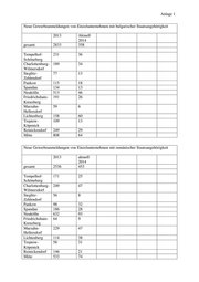 Anlage 1 Neue Gewerbeanmeldungen von Einzelunternehmen mit bulgarischer Staatsangehörigkeit 2013 Aktuell 2014 gesamt 2833 358 Tempelhof- 231 36 Schöneberg Charlottenburg- 189 34 Wilmersdorf Steglitz- 77 13 Zehlendorf Pankow 115 18 Spandau 134 13 Neukölln 513 46 Friedrichshain- 191 26 Kreuzberg Marzahn- 59 6 Hellersdorf Lichtenberg 158 60 Treptow- 109 13 Köpenick Reinickendorf 249 29 Mitte 808 64 Neue Gewerbeanmeldungen von Einzelunternehmen mit rumänischer Staatsangehörigkeit 2013 aktuell 2014 gesamt 2536 453 Tempelhof- 171 25 Schöneberg Charlottenburg- 249 47 Wilmersdorf Steglitz- 56 8 Zehlendorf Pankow 98 32 Spandau 186 28 Neukölln 632 93 Friedrichshain- 64 9 Kreuzberg Marzahn- 229 47 Hellersdorf Lichtenberg 114 38 Treptow- 58 31 Köpenick Reinickendorf 146 21 Mitte 533 74
