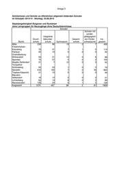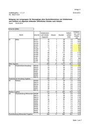 Anlage 4 SenBildJugWiss - I C 2.7 03.03.2014 Tel.: 90227-5722 Belegung von Lerngruppen für Neuzugänge ohne Deutschkenntnisse von Schülerinnen und Schülern an allgemein bildenden öffentlichen Schulen nach Schulen Stand: 03.03.2014 Schul-Art (Alle) Schülerin- Schülerinnen Vollzeit- nen und Bezirk Schul-Nr. und Schüler Klassen Stunden einheit Schüler/ insgesamt (VZE) VZE 01 Mitte 01G11 10 1 28 1,0 10,0 01G15 16 1 28 1,0 16,0 01G18 11 1 28 1,0 11,0 01G25 12 2 56 2,0 6,0 01G27 13 2 56 2,0 6,5 01G28 4 1 28 1,0 4,0 01G42 14 2 56 2,0 7,0 01G44 44 4 112 4,0 11,0 01G45 22 2 56 2,0 11,0 01G47 35 3 84 3,0 11,7 01S01 44 5 155 5,7 8,8 01S06 190 15 465 17,2 12,7 01Y11 29 2 62 2,4 14,5 Mitte Ergebnis 444 41 1.214 44,3 10,8 02 Friedrichshain-Kreuzberg 02G16 12 2 56 2,0 6,0 02G22 24 2 56 2,0 12,0 02G23 10 1 28 1,0 10,0 02K01 12 1 31 1,2 12,0 02K04 24 2 62 2,4 12,0 02K05 24 2 62 2,4 12,0 02K10 22 2 62 2,4 11,0 Friedrichshain-Kreuzberg Ergebnis 128 12 357 13,3 10,7 03 Pankow 03G03 14 1 28 1,0 14,0 03G15 12 1 31 1,1 12,0 03G16 25 2 56 2,0 12,5 03G41 24 2 56 2,0 12,0 03K07 38 3 93 3,6 12,7 03Y13 11 1 31 1,2 11,0 Pankow Ergebnis 124 10 295 10,9 12,4 04 Charlottenburg-Wilmersdorf 04G08 24 2 56 2,0 12,0 04G13 24 2 56 2,0 12,0 04G14 11 1 28 1,0 11,0 04G20 36 3 84 3,0 12,0 04K02 18 1 31 1,2 18,0 04K03 12 1 31 1,2 12,0 04K06 11 1 31 1,2 11,0 04Y02 21 2 62 2,4 10,5 04Y04 14 1 31 1,2 14,0 04Y07 14 1 31 1,2 14,0 04Y09 24 2 62 2,4 12,0 Charlottenburg-Wilmersdorf Ergebnis 209 17 503 18,7 12,3 Seite 1 von 7