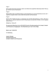 Frage 7: Gibt es eigene Planungen des Senats, welche in den Bereich des angeführten Beschlusses fallen? Wenn ja, ggf. welchen Inhalts und Sachstands? Frage 8: Welche Stellen haben grundsätzlich Einfluss auf die Entscheidung, ob und wann Beschlüsse wie der unter 1. angeführte umgesetzt werden, welche Stelle fällt letztendlich die Entscheidung? Frage 9: Welchen Weg empfiehlt der Senat, um gemeinsam eine eventuelle Alternativlösung zu finden, sollte die im Sinne des zu 1. genannte Maßnahme des BVV-Beschlusses aus bestimmten Gründen so nicht umgesetzt werden können? Antwort zu 1 bis zu 9: Der genannte Beschluss ist am 05.08.2019 bei der Senatsverwaltung für Umwelt, Verkehr und Klimaschutz eingegangen. Eine Bearbeitung ist noch nicht erfolgt. Berlin, den 15.08.2019 In Vertretung Ingmar Streese Senatsverwaltung für Umwelt, Verkehr und Klimaschutz 2