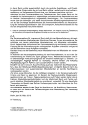 im Land Berlin erfolgt ausschließlich durch die zentrale Ausbildungs- und Einstel- lungsbehörde. Zudem sieht das im Land Berlin gültige Laufbahnrecht eine Laufbahn- ausbildung zur Verfassungsschützerin bzw. zum Verfassungsschützer nicht vor. Allerdings ist eine Zusatzausbildung von Teilnehmenden des Landes Berlin an der Akademie für Verfassungsschutz regelmäßiger und verbindlicher Bestandteil von neu im Berliner Verfassungsschutz eingestellten Beschäftigten. Die Zusatzausbildung wurde über die bisherigen und weiter fortzuführenden Fortbildungsmaßnahmen hin- aus auf der Grundlage des Beschlusses der Innenministerkonferenz zur Neuausrich- tung des Verfassungsschutzes im Jahr 2012 eingeführt, fortlaufend evaluiert und hat sich als erfolgreiches Instrument etabliert. 5. Plant die zuständige Senatsverwaltung weitere Maßnahmen, um mögliche, durch die Überalterung der Verwaltung hervorgerufenen Engpässe frühzeitig zu erkennen und zu begleichen? Zu 5.: Die Senatsverwaltung für Inneres und Sport stellt sich der Herausforderung, sich wei- terhin als attraktiver Arbeitgeber des öffentlichen Dienstes für neu einzustellende Be- schäftigte und bereits beschäftigte Mitarbeiterinnen und Mitarbeiter aufzustellen. Durch zielgerichtete Maßnahmen der Personalentwicklung wird bereits vorhandenes Personal bei der Wahrnehmung der umfangreichen Aufgaben unterstützt und gezielt auf die Übernahme neuer Aufgaben vorbereitet. Darüber hinaus ist die Gewinnung neuer Mitarbeiterinnen und Mitarbeiter ein vorran- giges Ziel. Im Rahmen der Haushaltsplanaufstellung für den Personalbereich, ist es in der Se- natsverwaltung für Inneres und Sport gängige Praxis, Altersstrukturanalysen und ei- ne altersbedingte Fluktuationsprognose der einzelnen Abteilungen zu erstellen. Die altersbedingten Abgänge können so rechtzeitig erkannt werden und frühzeitig (Nach)besetzungen im Rahmen von Auswahlverfahren initiiert werden. Bewährt hat sich in diesem Zusammenhang auch das Instrument des Wissenstrans- fers, dass den Abteilungen Stellendoppelbesetzungen ermöglicht. Dadurch kann das Erfahrungswissen vom ausscheidenden Mitarbeitenden an den/die Nachfolger/in weitergegeben werden. Ziel ist es, junge Menschen für die vielfältigen Aufgaben in der Senatsverwaltung für Inneres und Sport zu gewinnen. Im Bereich der Nachwuchskräfte (Regierungsin- spektoren/innen auf Probe / Regierungsräte/innen auf Probe) werden daher die at- traktiven Weiterbildungsmöglichkeiten und die Möglichkeit Beruf und Familie auf- grund attraktiver Arbeitszeitangebote zu vereinbaren, vorgestellt. Für eine dauerhafte Verwendung im Bereich des Berliner Verfassungsschutzes nach Abschluss der Pro- bezeit wird geworben. Auszubildende werden in der Regel im Anschluss an die Ausbildung übernommen, so dass auch im Bereich der Tarifbeschäftigten einer Überalterung der Verwaltung vorgebeugt wird. Berlin, den 06. März 2018 In Vertretung Torsten Akmann Senatsverwaltung für Inneres und Sport Seite 2 von 2