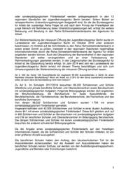 Senatsverwaltung für Integration, Arbeit und Soziales Herrn Abgeordneten Thomas Seerig (FDP) über den Präsidenten des Abgeordnetenhauses von Berlin über Senatskanzlei - G Sen - Antwort auf die Schriftliche Anfrage Nr. 18/16933 vom 02. November 2018 über Nachfragen zu Anfrage 18 / 16639 bzw. den Antworten des Senats dazu ------------------------------------------------------------------------------------------------------------------------------- Im Namen des Senats von Berlin beantworte ich Ihre Schriftliche Anfrage wie folgt: Ad 1: Teilt der Senat die Einschätzung, dass durch die Nichterhebung von Daten ein Vorher-Nachher- Vergleich schwierig und damit eine Aussage über die Wirkung der Initiative Inklusion unmöglich wird? Teilt der Senat die Einschätzung des Fragestellers, dass dies zur Rechtfertigung der ersatzlosen Abschaffung der Initiative Inklusion auch gewollt ist? Zu Ad 1.: Das Bundesprogramm Initiative Inklusion hat die Berichtspflichten der Länder detailliert beschrieben und somit den Auswertungsrahmen bundesweit festgelegt (siehe hierzu Bekanntmachung der Richtlinie des Bundesministeriums für Arbeit und Soziales vom 9. September 2011, veröffentlicht im Bundesanzeiger vom 30. September 2011). Die Frage nach der Intention des Senats bei der Festlegung der auszuwertenden Daten stellt sich daher nicht. Ad 2: Welche Konsequenzen zieht der Senat aus dem Umstand, dass zahlreiche Jugendliche mit Behinderung bzw. sonderpädagogischem Förderbedarf nicht durch die Jugendberufsagenturen sondern durch die Reha-Berater der Arbeitsagenturen betreut werden? (Vergleiche Anfrage 18/15 510) und dass es für die Standorte der Jugendberufsagenturen keinen einheitlichen Standort zur Barrierefreiheit gibt? Zu Ad 2.: § 1 der Vereinbarung über die Zusammenarbeit im Rahmen der Jugendberufsagentur Berlin vom 26. März 2015, die von den für Arbeit, Bildung und Jugend zuständigen Senatorinnen, der Vorsitzenden der Geschäftsführung der Regionaldirektion Berlin-Brandenburg der Bundesagentur für Arbeit und den zwölf Bezirksbürgermeisterinnen und Bezirksbürgermeistern unterzeichnet wurde, sieht vor, dass bei jungen Menschen mit Behinderung insbesondere der Inklusionsgedanke im Sinne der UN-Behindertenrechtskonvention gilt. Junge Menschen mit Behinderungen 1