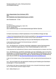 Senatsverwaltung für Justiz, Verbraucherschutz und Antidiskriminierung Herrn Abgeordneten Sven Kohlmeier (SPD) über den Präsidenten des Abgeordnetenhauses von Berlin über Senatskanzlei - G Sen - Antwort auf die Schriftliche Anfrage Nr. 18/13 179 vom 15. Januar 2018 über Veröffentlichungen von Gerichtsentscheidungen Berliner Gerichte ---------------------------------------------------------------------------------------------------------------------- Im Namen des Senats von Berlin beantworte ich Ihre Schriftliche Anfrage wie folgt: 1. Werden Gerichtsentscheidungen Berliner Gerichte ausschließlich auf http://gerichtsentscheidungen.berlin- brandenburg.de veröffentlicht oder auch auf anderen Internet-Portalen, ggf. welchen? Zu 1.: Eine Veröffentlichung erfolgt auch bei juris Das Rechtsportal und beck-online. 2. Nach welchem Kriterium werden Gerichtsentscheidungen veröffentlich? Wer hat diese Kriterien erstellt? Zu 2.: Die Richterinnen und Richter entscheiden selbständig, welche Gerichtsentschei- dungen veröffentlichungswürdig sind. Einen Kriterienkatalog gibt es hierfür nicht. 3. Wie lange dauert die Veröffentlichung? (Zeitraum zwischen Entscheidung/Urteil und Upload in das Portal). Zu 3.: Die Richterinnen und Richter entscheiden auch hier selbständig, wann sie ihre Ent- scheidungen zur Veröffentlichung geben. Nach Übermittlung der Entscheidung an die juris GmbH durch die Gerichte erfolgt in der Regel am nächsten Werktag die Veröffentlichung durch die juris GmbH auf http://gerichtsentscheidungen.berlin-brandenburg.de. 4. Wer ist für den Upload in das o.g. Portal verantwortlich, maW, wer stellt die Gerichtsentscheidungen dort ein? Zu 4.: Die juris GmbH ist für die technische Umsetzung der Einstellung der Gerichtsent- scheidungen im Portal verantwortlich. 5. Wie erklärt es sich, dass von einigen Berliner Gerichten viele und aktuelle Entscheidungen eingestellt sind, von anderen Berliner Gerichten hingegen weniger? Zu 5.: Siehe Antwort zu 2.