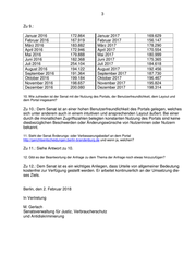 3 Zu 9.: Januar 2016 172.864 Januar 2017 169.629 Februar 2016 167.919 Februar 2017 156.147 März 2016 183.882 März 2017 178.290 April 2016 172.946 April 2017 170.554 Mai 2016 179.888 Mai 2017 180.999 Juni 2016 182.368 Juni 2017 175.365 Juli 2016 254.104 Juli 2017 184.618 August 2016 194.122 August 2017 192.456 September 2016 191.364 September 2017 187.730 Oktober 2016 199.184 Oktober 2017 196.467 November 2016 198.657 November 2017 195.824 Dezember 2016 200.080 Dezember 2017 198.314 10. Wie zufrieden ist der Senat mit der Nutzung des Portals, der Benutzerfreundlichkeit, dem Layout und dem Portal insgesamt? Zu 10.: Dem Senat ist an einer hohen Benutzerfreundlichkeit des Portals gelegen, welches sich unter anderem auch in einem intuitiven und ansprechenden Layout äußert. Bei einer durch die monatlichen Zugriffszahlen belegten konstanten Nutzung des Portals sind keine diesbezüglichen Beschwerden oder Änderungswünsche von Nutzerinnen oder Nutzern bekannt. 11. Sieht der Senat Änderungs- oder Verbesserungsbedarf an dem Portal http://gerichtsentscheidungen.berlin-brandenburg.de und wenn ja, welchen? Zu 11.: Siehe Antwort zu 10. 12. Gibt es der Beantwortung der Anfrage zu dem Thema der Anfrage noch etwas hinzuzufügen? Zu 12.: Dem Senat ist es ein wichtiges Anliegen, dass Urteile von allgemeiner Bedeutung kostenfrei zur Verfügung gestellt werden. Er arbeitet kontinuierlich an der Umsetzung die- ses Ziels. Berlin, den 2. Februar 2018 In Vertretung M. Gerlach Senatsverwaltung für Justiz, Verbraucherschutz und Antidiskriminierung
