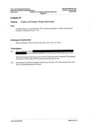 Freie und Hansestadt Hamburg allgemeinbildende und Behörde für Schule und Berufsbildung berufliche gymnasiale Abitur 2016 Deutsch auf erhöhtem Anforderungsniveau Oberstufen Aufgabe III Aufgabe III Thema: Poetik und Poesie: Robert Gernhardt Text: Gernhardt, Robert: Annus Mirabilis 1997. In: Robert Gernhardt: Im Glück und anderswo. Gedichte. Franldürt/ML 2014, S. 167. Zulässiges Arbeitsmittel: Robert Gernhardt: Was das Gedicht alles kann: Alles. Texte zur Poetik Teilaufgaben: 111. l „Ein verwahrlostes Sonettl (doch zumindest brauchbares?" (Aus: Was das Gedicht alles kann: Alles) Stellen $ie knapp und mit Bezug zu der zitierten Äußerung Robert Gernhardts Überlegungen zum Sonett in seiner dritten Poetikvorlesung Ordnung muß sein dar. III.2 . Interpretieren Sie Robert Gernhardts Sonett Annns Mirabilis 1997 und bewerten Sie es nach den von Gernhardt genannten Kriterien. Deul-eA-AB-2016 Seite 8 von 14