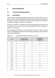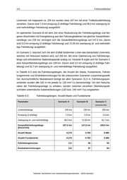 6 Wirtschaftlichkeit 169 Anzahl Busse Szenarien A und B Anzahl Busse Szenario C X49 9 9 Summe 169 116 Linie reduziertes Netz Die Linien 136, 137, 236, M32, M37 und X36 werden im Gegensatz zu den übrigen mit Gelenkbussen betriebenen Linien mit Doppelgelenkbussen bedient. Die gesamte Busflotte der Szenarien A und B von 169 Fahrzeugen für den Umlaufbetrieb unterteilt sich damit in 102 Gelenkbusse und 67 Doppelgelenkbusse. Im Szenario C entfallen gegenüber den Sze- narien A und B nur Linien, die mit Doppelgelenkbussen bedient werden. Damit ist die An- zahl der erforderlichen Gelenkbusse gegenüber den Szenarien A und B mit 102 Fahrzeu- gen unverändert. Die Flotte der erforderlichen Doppelgelenkbusse sinkt auf 14 Fahrzeuge. Für erforderliche Wartungs- und Instandhaltungsmaßnahmen und zur Sicherstellung des geplanten Umlaufbetriebes auch im Fall von Busstörungen müssen Reservebusse be- schafft werden. Die Anzahl von Reservefahrzeugen wurde in der vorliegenden Untersu- chung mit 10% der für den ungestörten Betriebsumlauf erforderlichen Busflotte angesetzt. Somit sind für die Szenarien A und B 11 Gelenkbusse und 7 Doppelgelenkbusse und im Szenario C 11 Gelenkbusse und 2 Doppelgelenkbusse als Reserve erforderlich. In Tabelle 6-2 sind für die untersuchten Szenarien die erforderlichen Busflotten zusammen- gestellt. Tabelle 6-2: Gesamtbusflotten der Szenarien A, B und C Busflotte Flotte für Umlauf GB / DGB Reserve GB / DGB Gesamtflotte Szenario C Szenario A Szenario B 102 / 67 102 / 67 102 / 14 11 / 7 11 / 7 11 / 2 187 187 129 6.1.2 Anlagen- und Mengengrüste Infrastruktur 6.1.2.1 Fahrleitung reduziertes Netz Im Szenario A als Basisszenario bezüglich des Elektrifizierungsgrades wurden lediglich Kreuzungen zur Vermeidung von Fahrleitungsweichen sowie optisch / architektonisch sen- sible Bereiche von der Fahrleitungsüberspannung ausgenommen. Von dem betrachteten Wissenschaftliche Beratung des BMVI zur Mobilitäts- und Kraftstoffstrategie