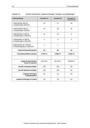 172 6 Wirtschaftlichkeit Tabelle 6-4: Anzahl Unterwerke, Ladeeinrichtungen, Schalter und Kabellängen Unterwerkstyp Szenario A Szenario B Szenario C reduziertes Netz 1 Gleichrichter (500 A), 1 Transformator 500 kVA 23 17 28 1 Gleichrichter (750 A), 1 Transformator 750 kVA 16 10 10 1 Gleichrichter (1.000 A), 1 Transformator 1.000 kVA 11 14 4 1 Gleichrichter (1.500 A), 1 Transformator 1.500 kVA 2 4 2 2 Gleichrichter (je 1.000 A), 2 Transformatoren je 1000 kVA 1 1 - Unterwerksanzahl gesamt 53 46 44 Grundstücksfläche gesamt 2.750 m² 2.300 m² 2.200 m² Länge Einspeisekabel (Guw-FL) gesamt 54.210 m 65.700 m 58.500 m Anzahl Leistungsschalter 129 103 93 Anzahl Masttrennschalter 129 103 93 Ladeeinrichtungen Endhaltestellen 10 13 10 Ladeeinrichtungen im Depot 18 18 13 Teilstudie „Machbarkeit eines Hybridoberleitungsbusbetriebs – „Berlin-Spandau“
