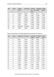 10 Anlage A –Technische Machbarkeit AB Spur Beginn (ca.) 293 Ende (ca.) Kilome- Kilometer ter Be- Ende Länge [km] ginn 13 r WKHS GLST 2,165 3,777 1,612 13 h FAZE ZESE 5,697 6,684 0,987 13 r FAZE ZESE 5,660 6,635 0,975 18 h FREI MCHD 2,030 3,946 1,916 18 r FREI MCHD 2,066 3,962 1,896 19 h UHS FAPL 0,000 1,866 1,866 19 r UHS FAPL 0,025 1,806 1,781 19 h2 WWLD01 WWLD01 4,126 4,131 0,005 26 h UWD UWD 0,596 0,601 0,005 Tabelle 10-15: Bereiche mit Verstärkungsleitungen innerhalb der AB, Szenario C AB Spur Beginn (ca.) Ende (ca.) Kilometer Kilometer Länge Beginn Ende [km] 01 h BIBG GAHE 7,596 9,600 2,004 01 r BIBG GAHE 7,561 9,558 1,997 03 h JOKA AMTG 0,821 3,200 2,379 03 r JOKA AMTG 0,930 3,216 2,286 03 h AMTG SMNO 3,300 4,097 0,797 03 r AMTG SMNO 3,254 4,058 0,804 03 h WTMB GAHE 5,486 11,122 5,636 03 r WTMB GAHE 5,467 11,022 5,555 03 h GAHE HEMA 11,198 12,713 1,063 03 r GAHE HEMA 11,147 12,658 1,114 03 h HEMA REIM 12,770 13,196 0,426 03 r HEMA REIM 12,713 13,243 0,530 04 h JEBN UERP 0,078 0,894 0,816 04 r JEBN UERP 0,265 0,880 0,615 04 h URUH TELT 7,154 8,888 1,734 04 r URUH TELT 7,154 8,836 1,682 Wissenschaftliche Beratung des BMVI zur Mobilitäts- und Kraftstoffstrategie