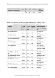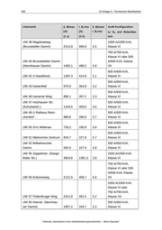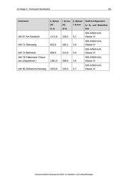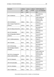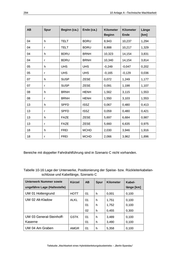 10 Anlage A –Technische Machbarkeit 294 AB Spur Beginn (ca.) Ende (ca.) Kilometer Kilometer Länge Beginn Ende [km] 04 h TELT BDRU 8,943 10,237 1,294 04 r TELT BDRU 8,888 10,217 1,329 04 h BDRU BRNH 10,323 14,154 3,831 04 r BDRU BRNH 10,340 14,154 3,814 05 h UHS UHS -0,249 -0,047 0,202 05 r UHS UHS -0,165 -0,129 0,036 07 h SUSP ZESE 0,072 1,249 1,177 07 r SUSP ZESE 0,091 1,198 1,107 08 h BRNH HENH 1,562 3,115 1,553 08 r BRNH HENH 1,550 3,103 1,553 13 h SPFD ISSZ 0,067 0,480 0,413 13 r SPFD ISSZ 0,059 0,480 0,421 13 h FAZE ZESE 5,697 6,684 0,987 13 r FAZE ZESE 5,660 6,635 0,975 18 h FREI MCHD 2,030 3,946 1,916 18 r FREI MCHD 2,066 3,962 1,896 Bereiche mit doppelter Fahrdrahtführung sind in Szenario C nicht vorhanden. Tabelle 10-16: Lage der Unterwerke, Positionierung der Speise- bzw. Rückleiterkabelan- schlüsse und Kabellänge, Szenario C Unterwerk Nummer sowie Kürzel AB Spur Kilometer ungefähre Lage (Haltestelle) Kabel- länge [km] UW 01 Hottengrund HOTT 01 h 0,001 0,100 UW 02 Alt-Kladow ALKL 01 h 1,751 0,100 01 h 1,752 0,100 02 h 0,455 0,300 01 h 3,489 0,100 01 h 3,490 0,100 01 h 5,358 0,100 UW 03 General-Steinhoff- Kaserne GSTK UW 04 Am Graben AMGR Teilstudie „Machbarkeit eines Hybridoberleitungsbusbetriebs – „Berlin-Spandau“