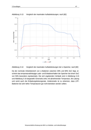 3 Grundlagen 47 Abbildung 3-13: Vergleich der maximalen Aufladeleistungen, nach [82] Abbildung 3-14: Vergleich der maximalen Aufladeleistungen der Li-Speicher, nach [82] Da der nominale Arbeitsbereich von Li-Batterien zwischen 30% und 80% SoC liegt, er- scheint das temperaturabhängige Lade- und Entladeverhalten der Speicher bei einem SoC von 50% besonders repräsentativ. Die sich ergebenden Verläufe sind in Abbildung 3-15 und Abbildung 3-16 dargestellt. Einerseits sinkt, mit abnehmender Temperatur, die Ladung und somit auch die Entladungsleistungsrate. Andererseits ist zu erkennen, dass LFP- Batterien bei sehr tiefen Temperaturen gar nicht betrieben werden sollten. Wissenschaftliche Beratung des BMVI zur Mobilitäts- und Kraftstoffstrategie