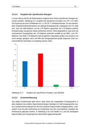 3 Grundlagen 3.3.2.4 49 Vergleich der spezifischen Energien Li-Ionen-Akkus sind für die Elektrotraktion aufgrund ihrer hohen spezifischen Energien be- sonders attraktiv. Abbildung 3-17 vergleicht die spezifischen Energien von LFP, LTO, NMC und Supercap bei einer Entladerate von 1 C bei 25 °C Arbeitstemperatur. Es wird deutlich, dass Doppelschichtkondensatoren als alleinige Energiespeicher ungeeignet sind. Es zeigt sich, dass die NMC-Batterie und die LFP-Batterie gegenüber der LTO-Batterie größere Energiemengen bei gleicher Masse aufnehmen können. Nicht dargestellt ist, dass auch die volumetrische Energiedichte der LTO-Batterie schlechter ausfällt als bei NMC- und LFP- Batterien. Das heißt, LTO-Batterien sind bei gleichen Kapazitäten größer und schwerer und somit weniger geeignet, wenn mit Hilfe des Energiespeichers große Distanzen ohne zwi- schenzeitliches Nachladen zurückgelegt werden sollen. Abbildung 3-17: 3.3.2.5 Vergleich der spezifischen Energien, nach [82] [82] Zusammenfassung Aus obigen Ausführungen geht hervor, dass keiner der vorgestellten Energiespeicher in allen Aspekten den anderen Speichertechnologien überlegen ist. Alle Energiespeicher wei- sen charakteristische Mängel auf, die ihren positiven Eigenschaften entgegenstehen. Letzt- endlich muss für jede Anwendung ein Kompromiss aus den verschiedenen Aspekten der Performance gefunden werden. In Abbildung 3-18 und Tabelle 3-11 sind die wichtigsten Eigenschaften der Energiespeicher übersichtlich gegenübergestellt. Wissenschaftliche Beratung des BMVI zur Mobilitäts- und Kraftstoffstrategie